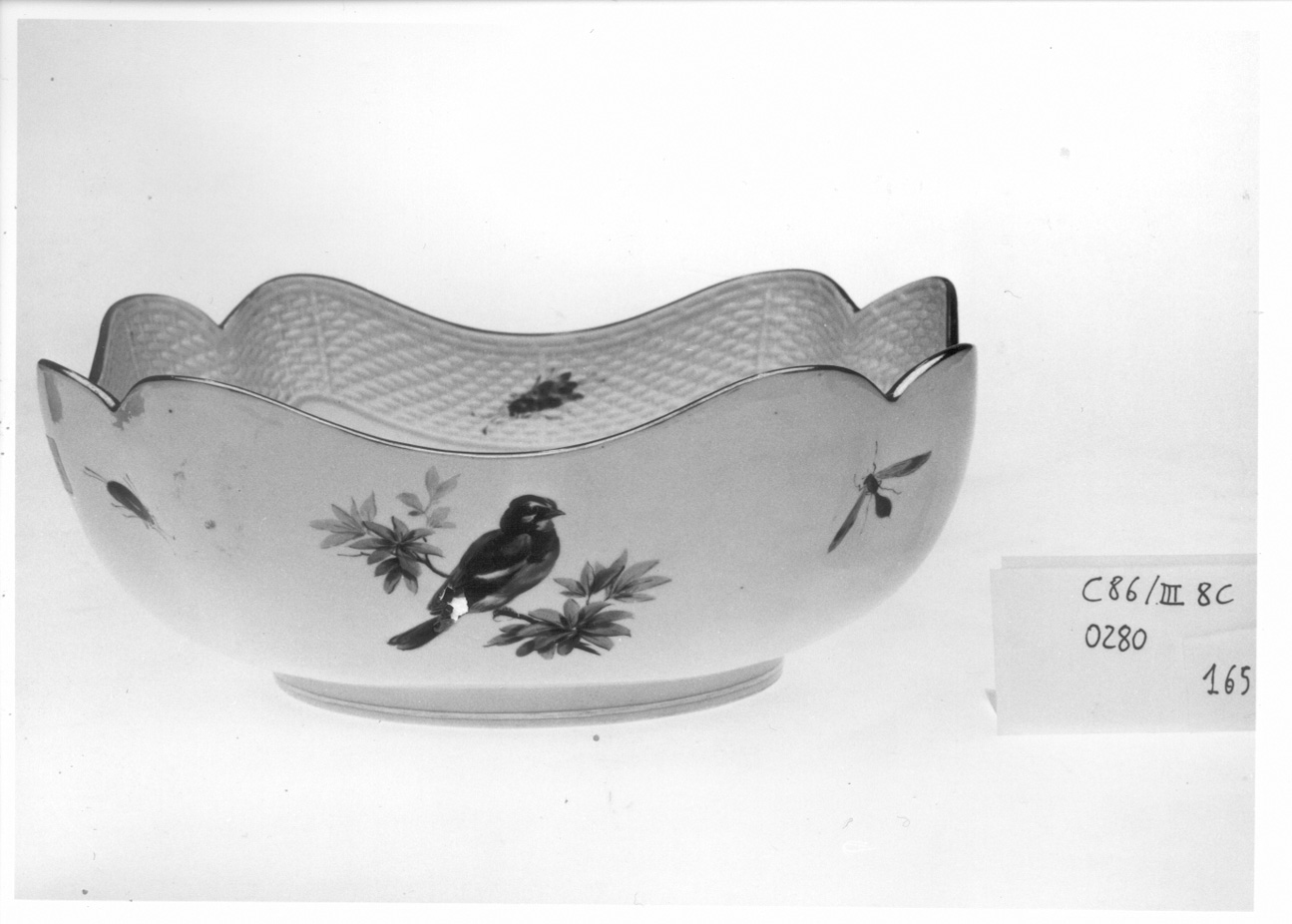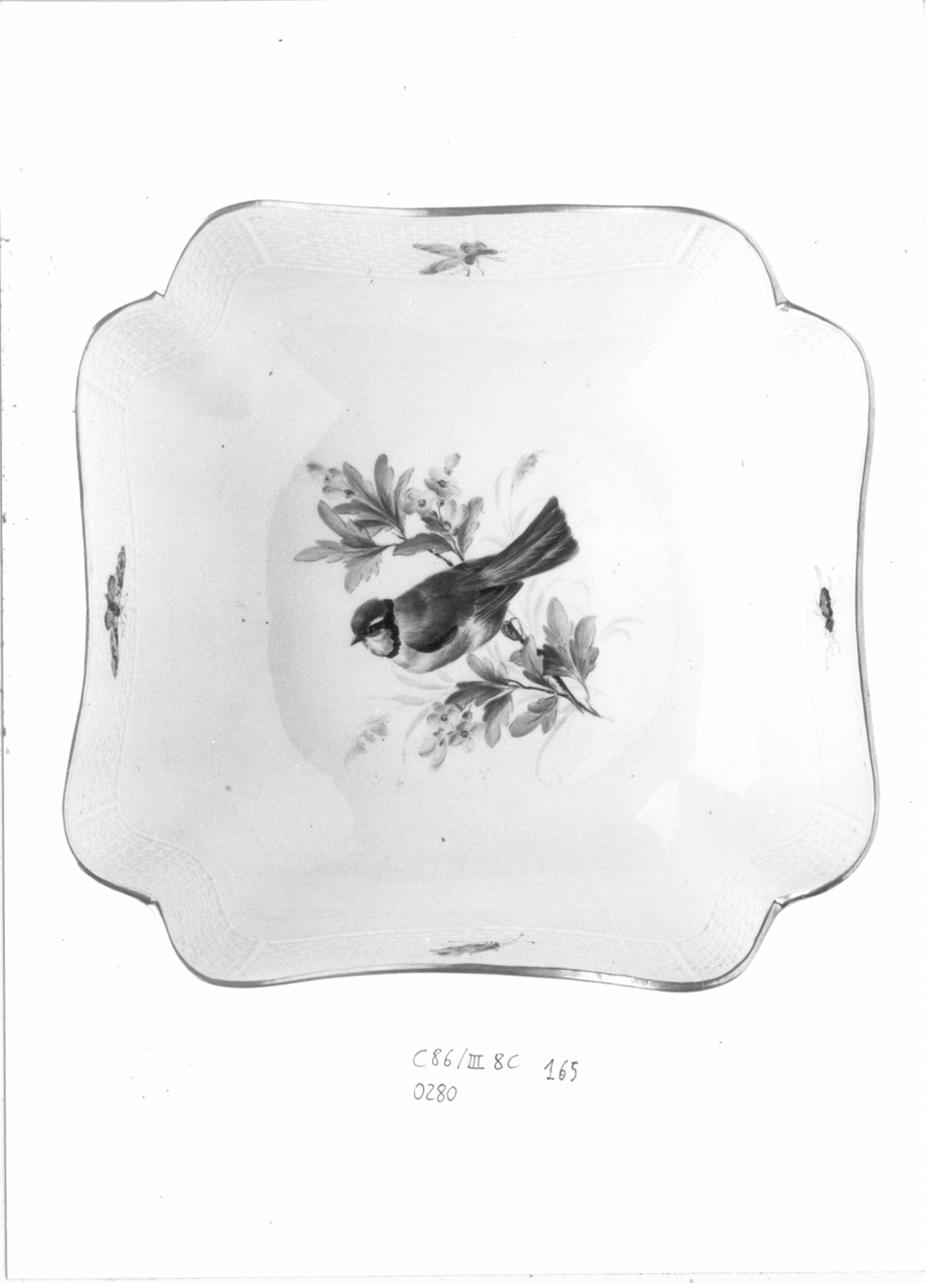 - NOTIZIE STORICO CRITICHE Casa Savoia si distingue nello scorcio dell'Ottocento per l'ordinazione di servizi orientati al gusto "neo-rococò" delle Manifatture di Berlino e di Meissen. Per Meissen le richieste si collegavano spesso anche all'esigenza di replicare molto oggetti facenti parte dei vecchi servizi provenienti dalle collezioni dei Borbone di Parma e dei Lorena, ormai ampiamente decurtati di molti pezzi (A. D'AGLIANO, "Porcellane e argenti", cit, scheda n. 75, pp. 241-242). Il presente servizio, che contava originariamente più di 2000 pezzi, molti dei quali furono ceduti al Palazzo del Quirinale il 6 agosto 1951, fu acquistato il 16 maggio 1986 (1882. "Argenti Vasellame", bolletta di carico n. 16) e corrisponde appieno al tipo di revival "neo-rococò" di cui si è detto, che la Manifattura di Meissen alimentava assecondando le aspettative del pubblico dei prodotti di porcellana. In particolare il servizio torinese si avvale del decoro pittorico "Deutsche Vogel" e di un bordo a rilievo "Alt Ozier", che si rifanno a modelli del 1736, di J. F. Eberlein (A. D'AGLIANO, in "Porcellane e argenti del Palazzo Reale di Torino", catalogo della mostra a cura di A. GRISERI e G. ROMANO, Milano 1986, scheda n. 75, pp. 241-242). La consistenza di questa serie nell'inventario del 1882 è di 6 esemplari
