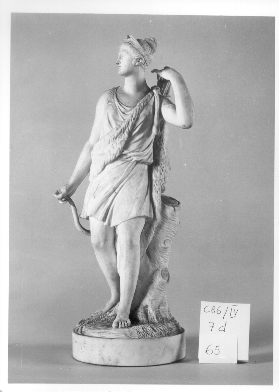 Statuetta che fa parte dell'anello di contorno del centrotavola. Base cilindrica a fondo concavo. Figura vestita con corta tunica cinta di pelle; faretra a tracolla; arco appoggiato al suolo tenuto con la destra; tronco d'albero sul lato sinistro