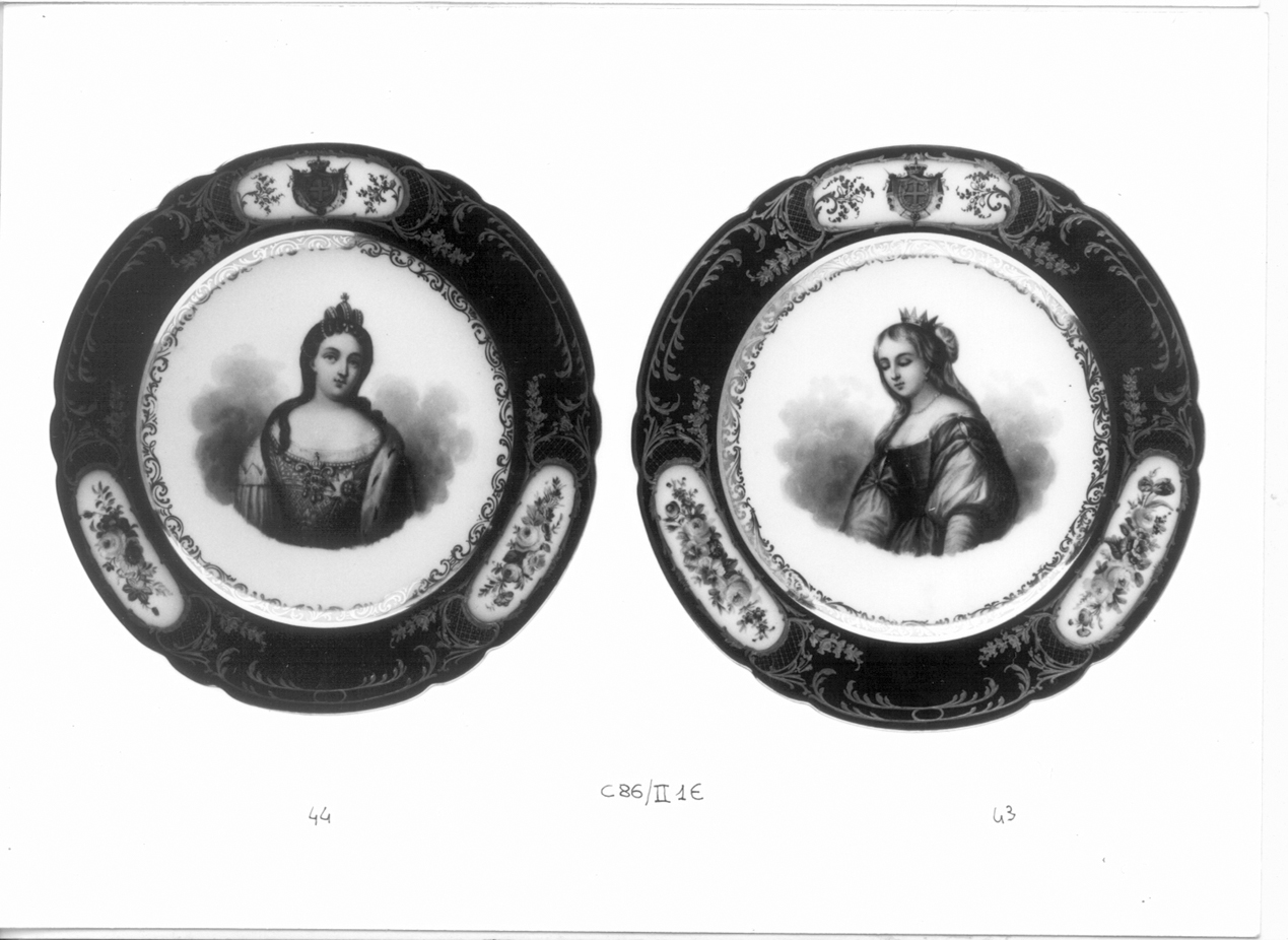 - NOTIZIE STORICO CRITICHE Il servizio da dessert, registrato nell'inventario del 1882 "Argenti Vasellame D.C.", come "Porcellana di Francia moderna finissima a mezze figure rapresentanti le donne più celebri d'Europa, con medaglioni a fiori, a rabeschi in oro e stemma Reale su fondo bleu scuro" (p. 201), era collocato, al momento della preschedatura del 1986, negli scaffali D-E, amadio n. 1, della sala 2 del mezzanino di Palazzo Reale. Le quattro geliere con il coperchio di scorta erano invece custodite, forse a causa dell'elaborata e massiccia montatura in bronzo dorato che poteva permetterne un impego decorativo autonomo, al piano terreno, sala degli argenti, armadio n. 7, scaffale C. La consistenza per singole tipologie documentata nel 1871 dall'inventario "Rami Porcellane Cristalli" è di 275 "tondi a frutta", 6 zuccheriere, 109 tazze da caffè con 115 piattini, 4 "grandi vasi per gelati" con coperchio di scorta di cui rimangono rispettivamente, 199 piatti, 5 zuccheriere, 109 tazze da caffè con 113 piattini e le 4 geliere con il coperchio di scorta. La perdita più consistente, 72 piatti da coltello, avvenne nell'arco di tempo compreso tra la stesura dell'inventario del 1911, che ne registrava 271, e quello del 1949, con gli attuali 199 (S. PETTANTI, in Porcellane e argenti del Palazzo Reale di Torino, catalogo della mostra a cura di A. GRISERI e G. ROMANO, Torino 1986, p. 318). Benché la serie dei soggetti per i ritratti a mezzo busto non segua un progetto unitario, si possono enucleare alcune categorie principali: regine di vari stati europei dal medioevo all'Ottocento, nobildonne, favorite di re, mogli e amanti di artisti, poetesse, attrici, cantanti, eroine della Bibbia e della letteratura, tipi regionali e nazionali, raffigurazioni simboliche e allegoriche, derivazioni da dipinti. Una sorta di eclettismo iconografico che accompagna il primato della pittura nella decorazione di porcellane durante tutto il secolo XIX e viene favorito dalla proliferazione di ateliers di decorazione che si registra nell'area parigina dopo il primo decennio. Le ripetute crisi economiche avvenute dopo l'Impero causarono la rovina di molte piccole imprese e costrinsero numerose industrie a ridurre il personale eliminando dal ciclo produttivo gli stadi relativi alla decorazione, che venivano rilevati da ateliers specializzati. Questa tendenza ebbe modo di radicalizzarsi sotto le difficoltà della Restaurazione, che portarono al trasferimento della produzione di base nelle località più convenienti allo sfruttamento della materia prima e della mano d'opera. A Parigi pervenivano così, dal limosino o dalla regione dell'Ile-de-France, pezzi privi di decorazione - i cosiddetti "bianchi" - che i decoratori provedevano a terminare secondo le richieste e i gusti di una clientela molto più numerosa e socialmente stratificata di quella di Ancien Régime (R. DE PLINVAL DE GUILLEBON, La porcelaine à Paris sous le Consulat et l'Empire, Parigi 1972, p. 7 e passim). Gli ateliers di pittura offrivano inoltre la possibilità di effettuare imprese decorative secondo le richieste e i gusti della clientela, aristocratica e borghese, europea e d'oltre oceano. In questa congiuntura economica e culturale si inserisce l'attività di Feuillet, che nel 1817 aprì il suo laboratorio al n° 18 dell'elegante Rue de la Paix e dal 1834 venne affiancato da Boyer (R. DE PLINVAL DE GUILLEBON, Porcelaine de Paris 1770-1850, Parigi 1972, pp. 228, 319 e passim; S. PETTENATI, cit., p. 318). La firma di Feuillet compare sul retro di un piatto (scheda allegata n. 78; spesso compare la lettera N incisa), l'unico privo dello stemma sabaudo su una delle tre riserve della tesa, un campione del repertorio di bottega inviato da Parigi nel corso delle trattative preliminari, puntualmente ripetuto da Boyer - con l'aggiunta dello stemma sabaudo e lievi varianti nella saturazione del colore e nello schema dei fregi dorati - nel servizio prescelto (S. PETTENATI, cit., p. 318). Da questi scambi pervennero probabilmente a Torino i due piatti con ritratti femminili e quello con Veduta di Villa della Regina (S. PETTENATI, cit., schede nn. 142-144, pp. 312-314), mentre gli acquisti del servizio sono frazionati nei Conti Categorici del 1850 e del 1852 pubblicati da S. PETTENATI (p. 318). Ancora alla cortesia di S. Pettenati devo la segnalazione della serie di dieci piatti firmati Boyer in verde e appartenenti alla serie delle "Donne più celebri d'Europa di tutti i tempi" apparse ultimamente sul mercato antiquario (F. SEMENZATO, Importanti mobili ed oggetti del XVIII e XIX secolo, Venezia 1987, p. 85, n. 83)