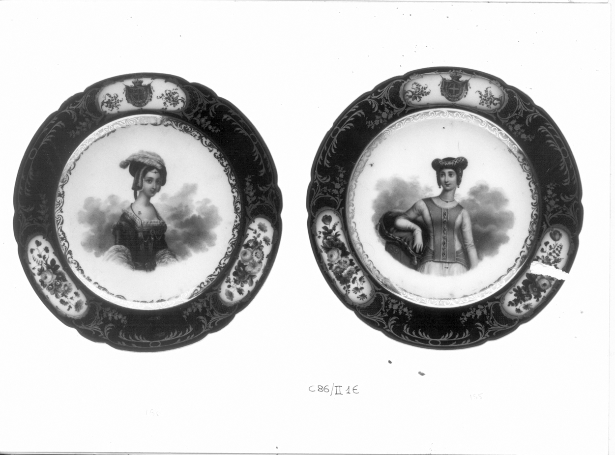 - NOTIZIE STORICO CRITICHE Il servizio da dessert, registrato nell'inventario del 1882 "Argenti Vasellame D.C.", come "Porcellana di Francia moderna finissima a mezze figure rapresentanti le donne più celebri d'Europa, con medaglioni a fiori, a rabeschi in oro e stemma Reale su fondo bleu scuro" (p. 201), era collocato, al momento della preschedatura del 1986, negli scaffali D-E, amadio n. 1, della sala 2 del mezzanino di Palazzo Reale. Le quattro geliere con il coperchio di scorta erano invece custodite, forse a causa dell'elaborata e massiccia montatura in bronzo dorato che poteva permetterne un impego decorativo autonomo, al piano terreno, sala degli argenti, armadio n. 7, scaffale C. La consistenza per singole tipologie documentata nel 1871 dall'inventario "Rami Porcellane Cristalli" è di 275 "tondi a frutta", 6 zuccheriere, 109 tazze da caffè con 115 piattini, 4 "grandi vasi per gelati" con coperchio di scorta di cui rimangono rispettivamente, 199 piatti, 5 zuccheriere, 109 tazze da caffè con 113 piattini e le 4 geliere con il coperchio di scorta. La perdita più consistente, 72 piatti da coltello, avvenne nell'arco di tempo compreso tra la stesura dell'inventario del 1911, che ne registrava 271, e quello del 1949, con gli attuali 199 (S. PETTANTI, in Porcellane e argenti del Palazzo Reale di Torino, catalogo della mostra a cura di A. GRISERI e G. ROMANO, Torino 1986, p. 318). Benché la serie dei soggetti per i ritratti a mezzo busto non segua un progetto unitario, si possono enucleare alcune categorie principali: regine di vari stati europei dal medioevo all'Ottocento, nobildonne, favorite di re, mogli e amanti di artisti, poetesse, attrici, cantanti, eroine della Bibbia e della letteratura, tipi regionali e nazionali, raffigurazioni simboliche e allegoriche, derivazioni da dipinti. Una sorta di eclettismo iconografico che accompagna il primato della pittura nella decorazione di porcellane durante tutto il secolo XIX e viene favorito dalla proliferazione di ateliers di decorazione che si registra nell'area parigina dopo il primo decennio. Le ripetute crisi economiche avvenute dopo l'Impero causarono la rovina di molte piccole imprese e costrinsero numerose industrie a ridurre il personale eliminando dal ciclo produttivo gli stadi relativi alla decorazione, che venivano rilevati da ateliers specializzati. Questa tendenza ebbe modo di radicalizzarsi sotto le difficoltà della Restaurazione, che portarono al trasferimento della produzione di base nelle località più convenienti allo sfruttamento della materia prima e della mano d'opera. A Parigi pervenivano così, dal limosino o dalla regione dell'Ile-de-France, pezzi privi di decorazione - i cosiddetti "bianchi" - che i decoratori provedevano a terminare secondo le richieste e i gusti di una clientela molto più numerosa e socialmente stratificata di quella di Ancien Régime (R. DE PLINVAL DE GUILLEBON, La porcelaine à Paris sous le Consulat et l'Empire, Parigi 1972, p. 7 e passim). Gli ateliers di pittura offrivano inoltre la possibilità di effettuare imprese decorative secondo le richieste e i gusti della clientela, aristocratica e borghese, europea e d'oltre oceano. In questa congiuntura economica e culturale si inserisce l'attività di Feuillet, che nel 1817 aprì il suo laboratorio al n° 18 dell'elegante Rue de la Paix e dal 1834 venne affiancato da Boyer (R. DE PLINVAL DE GUILLEBON, Porcelaine de Paris 1770-1850, Parigi 1972, pp. 228, 319 e passim; S. PETTENATI, cit., p. 318). La firma di Feuillet compare sul retro di un piatto (scheda allegata n. 78; spesso compare la lettera N incisa), l'unico privo dello stemma sabaudo su una delle tre riserve della tesa, un campione del repertorio di bottega inviato da Parigi nel corso delle trattative preliminari, puntualmente ripetuto da Boyer - con l'aggiunta dello stemma sabaudo e lievi varianti nella saturazione del colore e nello schema dei fregi dorati - nel servizio prescelto (S. PETTENATI, cit., p. 318). Da questi scambi pervennero probabilmente a Torino i due piatti con ritratti femminili e quello con Veduta di Villa della Regina (S. PETTENATI, cit., schede nn. 142-144, pp. 312-314), mentre gli acquisti del servizio sono frazionati nei Conti Categorici del 1850 e del 1852 pubblicati da S. PETTENATI (p. 318). Ancora alla cortesia di S. Pettenati devo la segnalazione della serie di dieci piatti firmati Boyer in verde e appartenenti alla serie delle "Donne più celebri d'Europa di tutti i tempi" apparse ultimamente sul mercato antiquario (F. SEMENZATO, Importanti mobili ed oggetti del XVIII e XIX secolo, Venezia 1987, p. 85, n. 83)