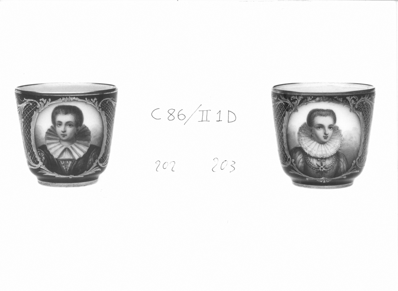 Orlo piano, parete svasata, manico a voluta bipartita, base ad anello. Ritratto femminile a mezzo busto dipinto in policromia su fondo bianco