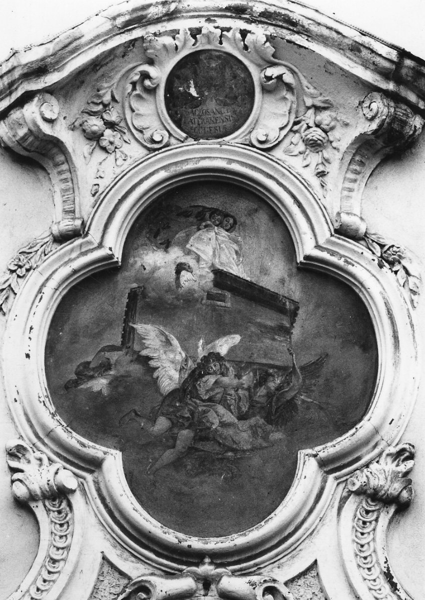 - NOTIZIE STORICO CRITICHE Si tratta di una copia di qualità molto modesta del celebre affresco dipinto da Giambattista Tiepolo sulla volta della chiesa degli Scalzi a Venezia nel 1743. Il dipinto, distrutto in un bombardamento del 1915, ci è noto attraverso una fotografia e un bozzetto preparatorio pubblicati da G. Fogolari nel 1931 (Il bozzetto di Tiepolo per il trasporto della Santa Casa di Loreto, in "Bollettino d'Arte", XXV, 1931, pp. 18-32; cfr. anche A. Morassi, G.B. Tiepolo: his life and work, London 1955, fig. 23, e, per i bozzetti, A. Morassi, A complete catalogue of the paintings of G.B. Tiepolo, London 1962, figg. 87-88). La datazione dell'affresco, che semplifica la composizione, appesantisce i tratti delle figure anche con l'impiego di una gamma cromatica dai toni ostentatamente squillanti, va probabilmente legata a quella della decorazione in stucco del portale. Più che ad una copia dall'originale, si deve pensare alla presenza di modelli circolanti sotto forma di incisioni, ancor più se si tiene conto di un altro episodio della fortuna del dipinto di Tiepolo come quello della copia conservata al museo del Santuario di Loreto e che porta per ora una generica datazione al XIX secolo (F. Grimaldi, Loreto. Palazzo Apostolico, Bologna 1977). Fatti come questo possono aver avuto una funzione di tramite, dati anche i legami che univano il santuario marchigiano alla chiesa di Santa Maria di Loreto. Difficile invece, allo stato attuale, valutare il tondo con l'arma della Santa Sede; la presenza di un soggetto analogo è attestata già nella descrizione di Giovanni D'Aponte nel 1755, ed è probabile che esso sia strato fedelmente ripreso in questa versione più tarda (G. D'Aponte, Relazione e descrizione della pianta della chiesa, ospedale e casamenti di ragione della confraternita della SS. Trinità sotto il titolo de S. Vergine di Loreto, ms. 1755, Archivio della Confraternita di S. Maria di Loreto, ora presso l'archivio della Curia di Tortona, cartella D n.5)
