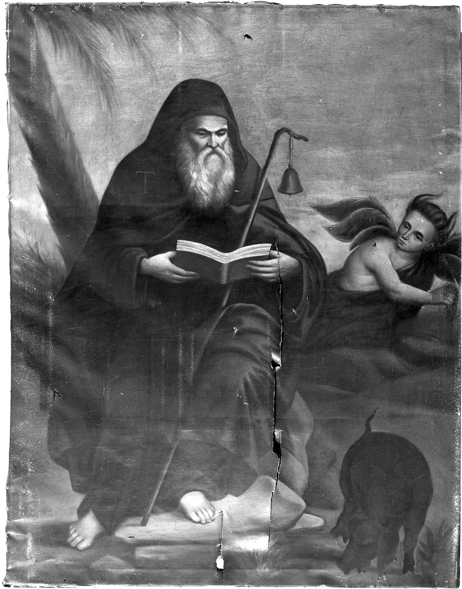 Il dipinto raffigura Sant'Antonio in un luogo desertico: si intravedono una palma e delle rocce. Il santo è ritratto seduto, con la veste blu e il manto marrone, tiene un libro aperto avanti a sè. Alla sua sinistra sono un demone e un maiale: il dipinto rappresenta infatti le tentazioni di S. Antonio eremita