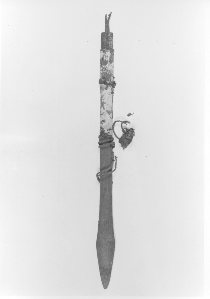 Fodero rivestito di cuoio impresso con motivi geometrici; cordone a torciglione: lama piatta