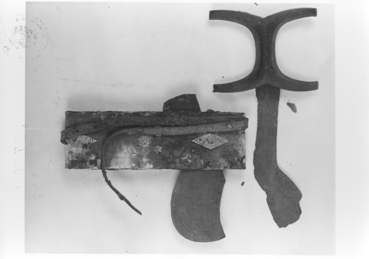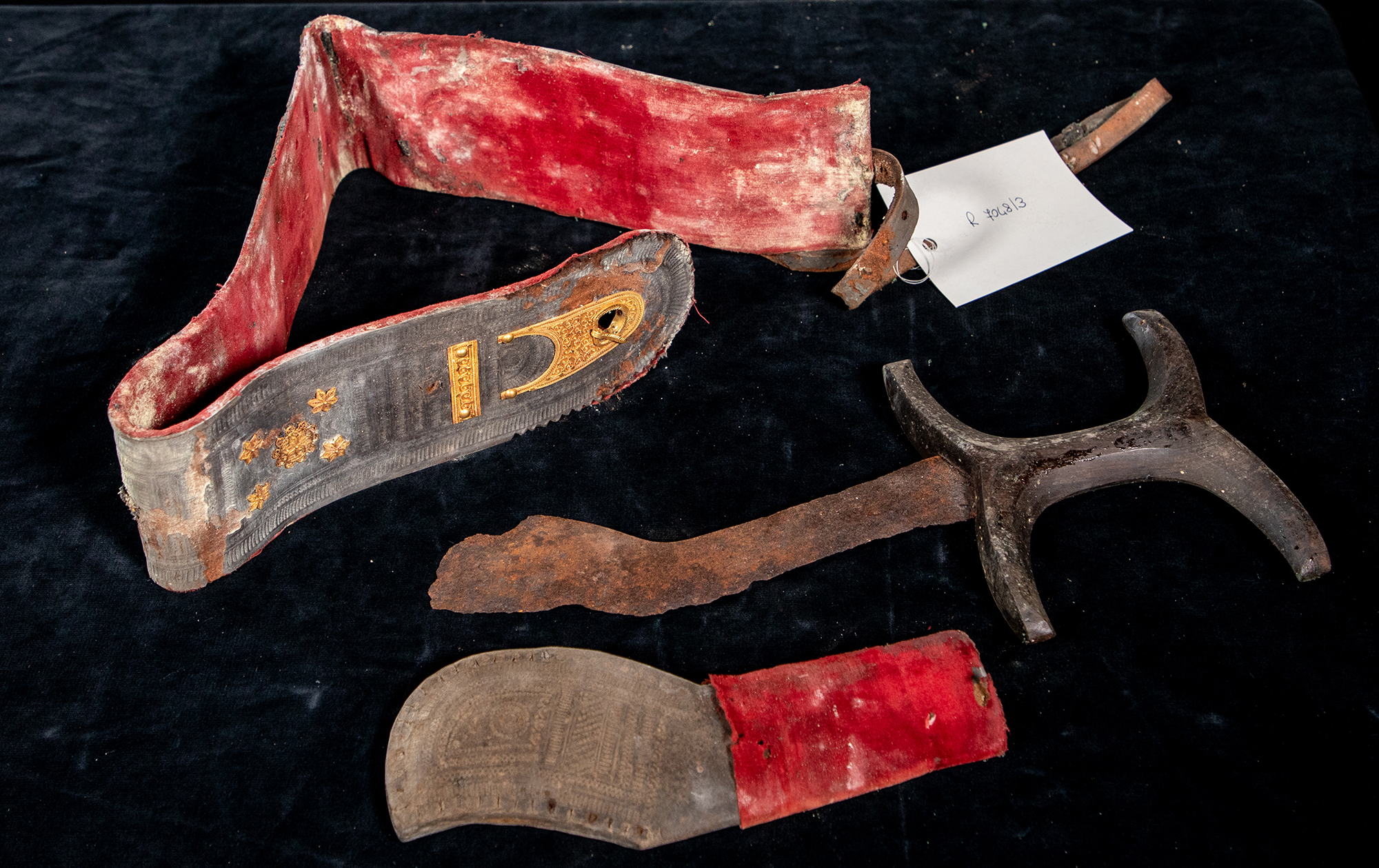 Pugnale con impugnatura in ferro e lama sottile ricurva; fodero con decorazioni a stella e placchette romboidali. Dotato di cinturone