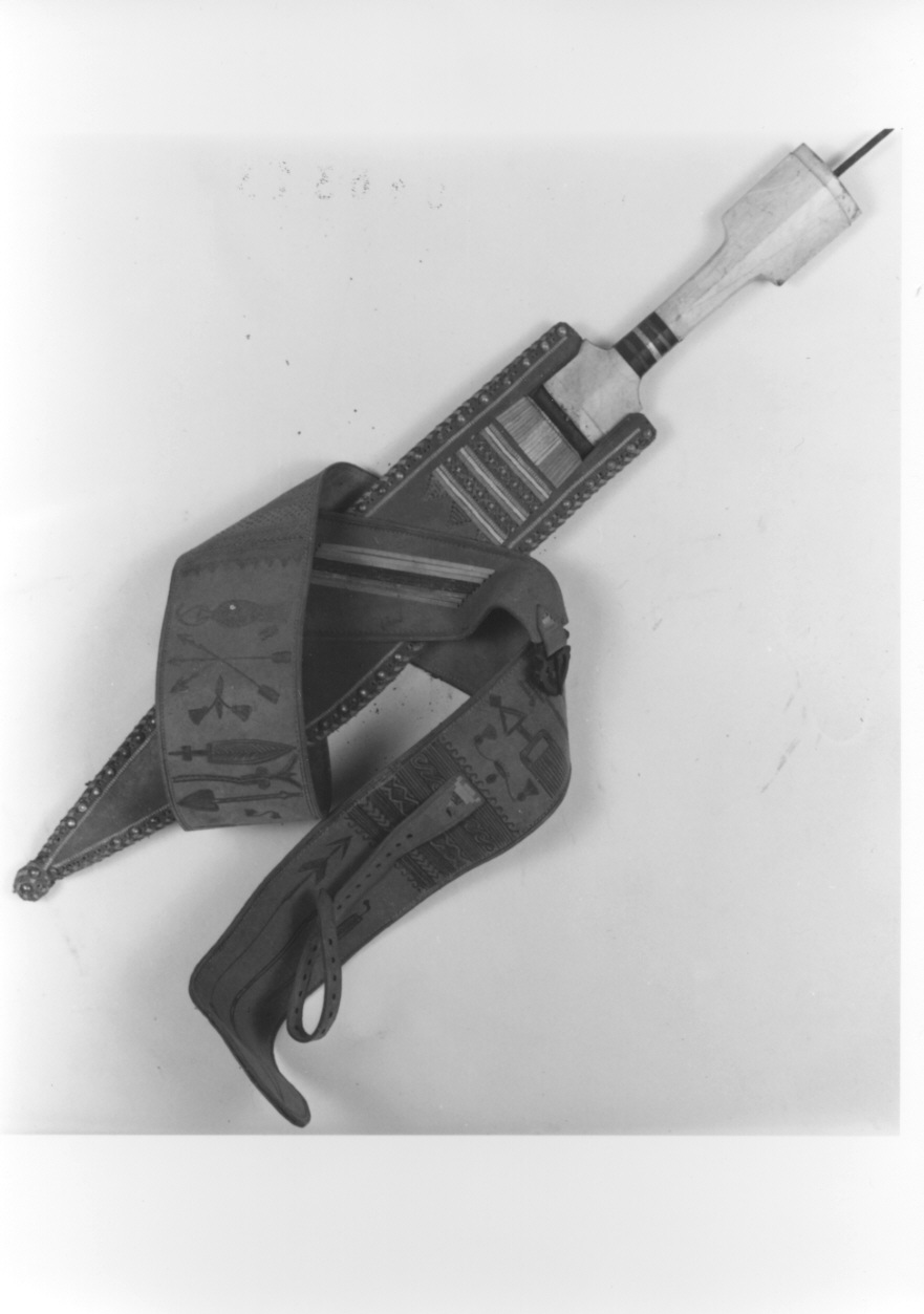 Impugnatura a sezione circolare. Fodero con piccoli trafori a graticcio. Dotata di cinturone decorato da fasce geometrice, armi, frecce