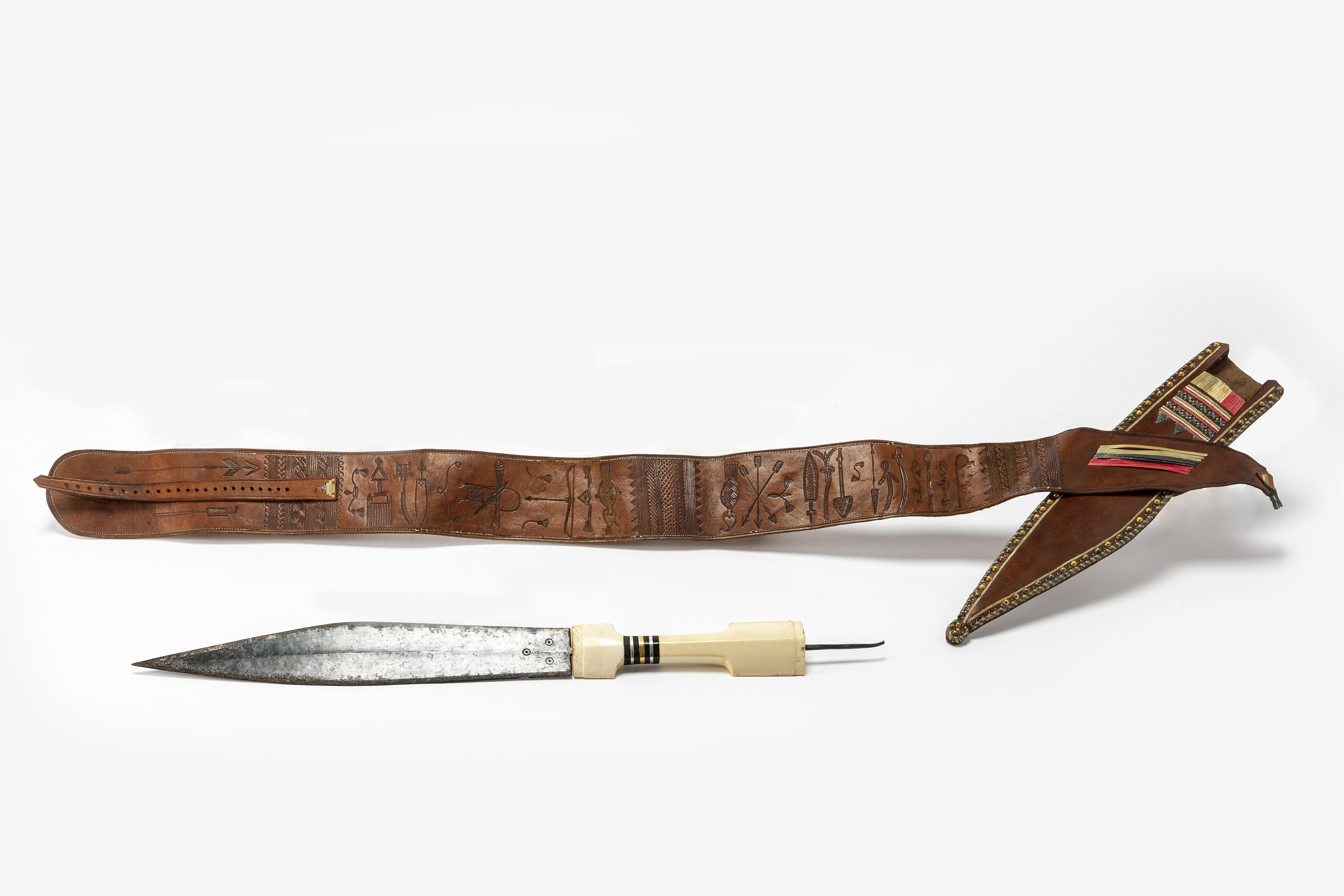 - NOTIZIE STORICO CRITICHE Nelle raccolte del Castello sono presenti diversi pugnali di tipologia billao, acquisiti o nell'ambito delle missioni diplomatiche accolte a Racconigi all'inizio del Novecento da Vittorio Emanuele III o, più verosimilmente, in occasione dei viaggi compiuti nel continente africano dall'erede al trono d'Italia tra gli anni venti e trenta. Questo esemplare è dotato di una cintura in cuoio ornata a impressio-ne, con fasce geometriche, armi, frecce ed elementi che rimandano al combattimen-to, e connotata da alcuni inserti in pelle tinta. Analoga decorazione si ritrova sul fodero dell'arma, ulteriormente arricchito sul profilo con trafori, cuciture e piccole borchie metalliche. Fino al 1989 il pugnale si trovava applicato ad un pannello in legno con altri manufatti simili come trofeo. Nell'inverno di quell'anno l'arma è stata rimossa dal supporto ed è stato operato un trattamento con protettivo rimovibile in ragia minerale. Al momento delle schedature di revisione (2002, 2016 e 2020) l'arma è stata rinvenuta in un locale adibito a deposito, distaccata dal supporto ed avvolte in carta velina. Il pannello pannello, che non è stato riutilizzato, versa in pessimo stato di conservazione. L'arma può essere confrontata con alcuni pugnali conservati presso l'Armeria Reale di Torino (Inv. n. H250, H251, H252, H298). Il pugnale billao è tipico della produzione somala e keniota