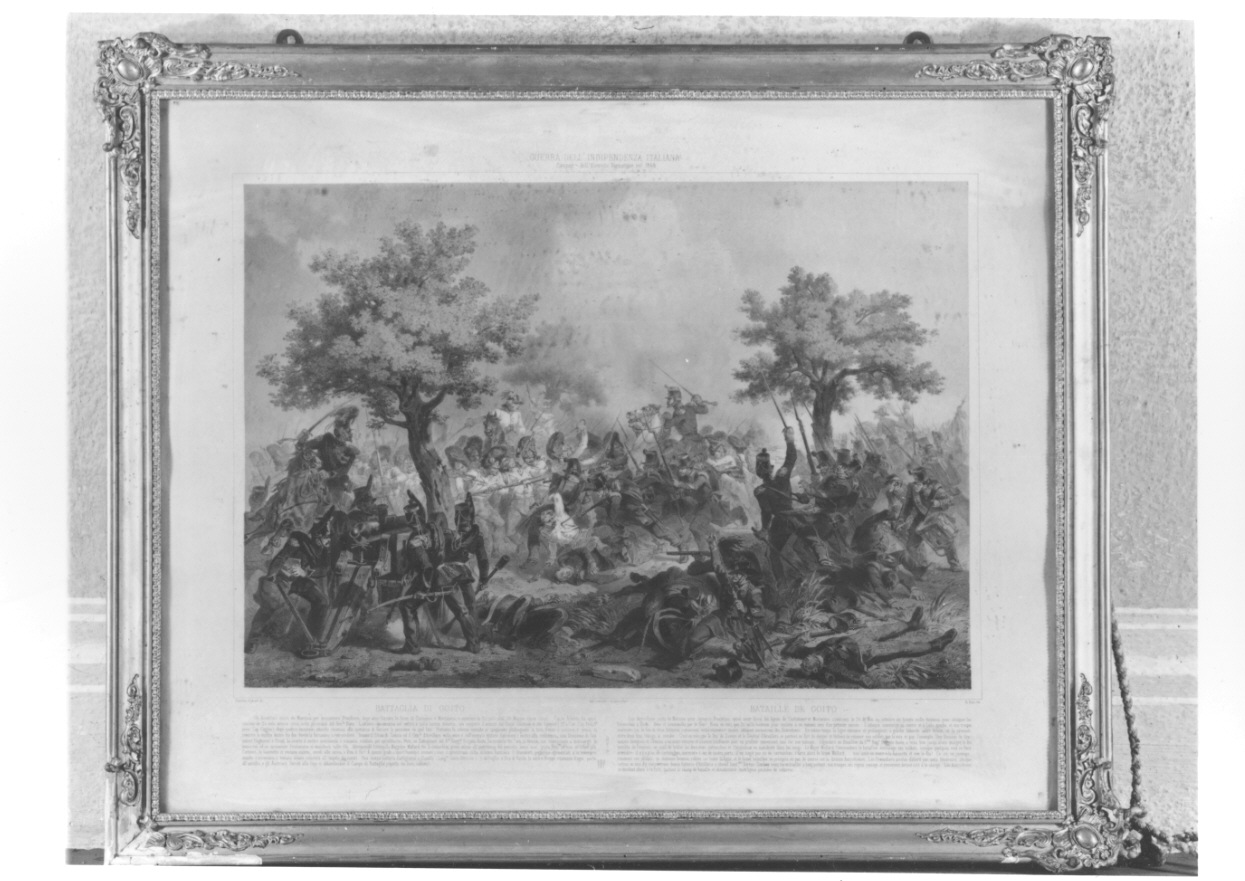 - NOTIZIE STORICO CRITICHE L'autore, il conte Stanislao Grimaldi del Poggetto, artista dilettante e ufficiale nel reggimento di Genova Cavalleria, nelle cui file prese parte alle campagne di guerra del 1848-1849, fu incaricato dal generale Alfonso La Marmora, ministro della Guerra, di comporre una serie di tavole illustranti i fatti d'arme più importanti e gli atti di audacia accaduti nelle Guerre dell'Indipendenza Italiana. Il lavoro, concepito per onorare il valore dell'esercito piemontese, e da pubblicarsi a spese dello Stato, venne eseguito a Parigi, dove il Grimaldi soggiornò negli anni tra il 1850 e il 1854, con il compito di curare la pubblicazione dell'opera, in stretta collaborazione con gli abili disegnatori (Bayot, Bour, Ciceri, David, Gaildrau ecc.) del famoso stabilimento litografico artistico diretto da Lemercier (va ricordato che, dopo il 1848, lo stampatore francese fu tra i primi a utilizzare la cromolitografia, (cfr. La Litografia, 1982, pp. 10 e segg.). Il Grimaldi nei suoi Ricordi (S. Grimaldi del Poggetto, 1894, II, pp. 29 e segg.), ci fornisce numerose indicazioni sui tempi e sui modi di esecuzione delle tavole. Per ottenere la massima precisione al momento della riproduzione sulla pietra litografica, il disegno originale viene preparato dall'autore in doppia copia: nella prima è delineato al semplice tratto con lapis di piombo, a "mezza macchia", studiato nel contorno e preciso nel dettaglio, nella seconda viene realizzato in chiaro-scuro, all'acquerello. Anche il testo, in italiano e francese, è redatto dal Grimaldi, ed è tradotto in litografia da scrivani specializzati. Alcune tavole, di dimensioni minori, sono realizzate in cromolitografia, a 4 colori; inoltre veniamo a sapere che la tiratura è di 1200 copie per tavola. Altre notizie sulla realizzazione della serie si possono trovare nelle lettere inviate dall'autore al generale La Marmora per metterlo al corrente sullo stato dei lavori: le carte sono oggi conservate presso l'Archivio di Stato di Biella. La collezione completa consta di 15 grandi tavole e 20 tavole di formato minore, in fogli sciolti. Mancando di un foglio di frontespizio, verrà qui adottato per individuare la serie il titolo fornito dall'autore stesso, reperito nel catalogo degli oggetti esposti nel padiglione del Risorgimento all'Esposizione Italiana di Torino del 1884 (Esposizione 1888, pp. 187-188). Il grande successo che l'opera al suo apparire riscosse presso il pubblico perdurava ancora sullo scorcio del secolo quando, ormai esaurite le litografie originali, si sentì l'esigenza di farne una riproduzione facsimile, autorizzata dal Ministero della Guerra e dall'autore, con le immagine in eliotipia, senza le didascalie del Grimaldi, sostituite da un nuovo testo a cura del generale Severino Zanelli. Fin dal 1855 n. 20 stampe del Grimaldi risultano incorniciate alle pareti della camera da letto e di una camera di trattenimento dei giovanissimi principi Tommaso e Margherita, figli di Ferdinando Duca di Genova (Agliè 1855, pp. 35-36). La serie di litografie è per un aspetto testimonianza e ricordo delle Campagne 1848-1849 alle quali Ferdinando partecipò, distinguendosi nel celebre combattimento alla Bicocca, per altro aspetto la loro presenza è anche giustificata dal fatto che forse il Duca intervenì economicamente alla realizzazione delle medesime (cfr. la lettera di Grimaldi a La Marmora, datata 22.3.1852)