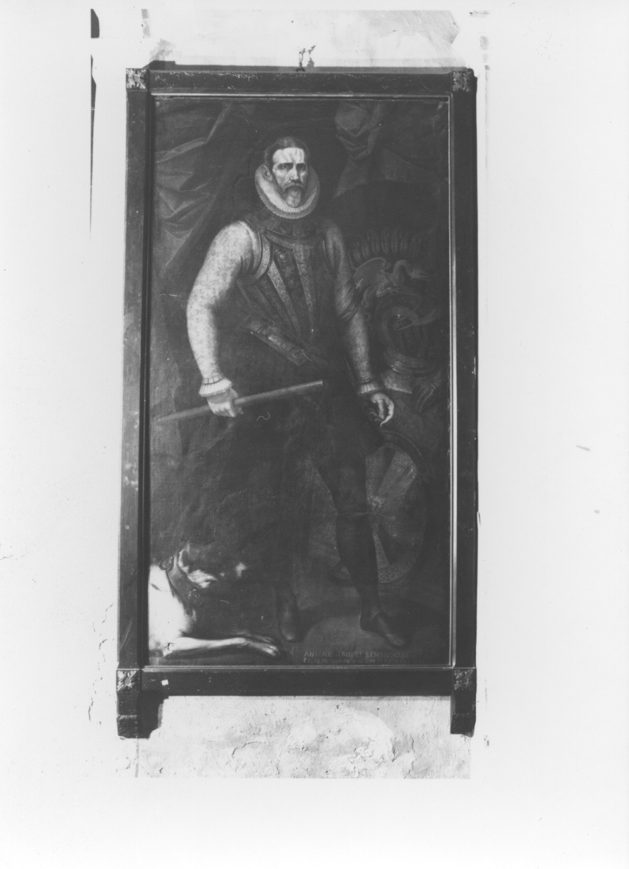 La cornice ha rosoni dorati agli angoli. La figura maschile si staglia davanti ad una tenda rosso-cupo ed a un trofeo di armi. Indossa, sopra la giubba bianca con decori a "nodi vinciani" in nero e oro e lattughe sia ai polsi che al collo, una corazza ornata da bande orizzontali con tralci stilizzati su un fondo bruno o dorato. I calzoni sono gonfi edindossati su calze aderente e scure. Con la sinistra trattiene il bastone del comando. Il cane ai suoi piedi ha il collare rosso