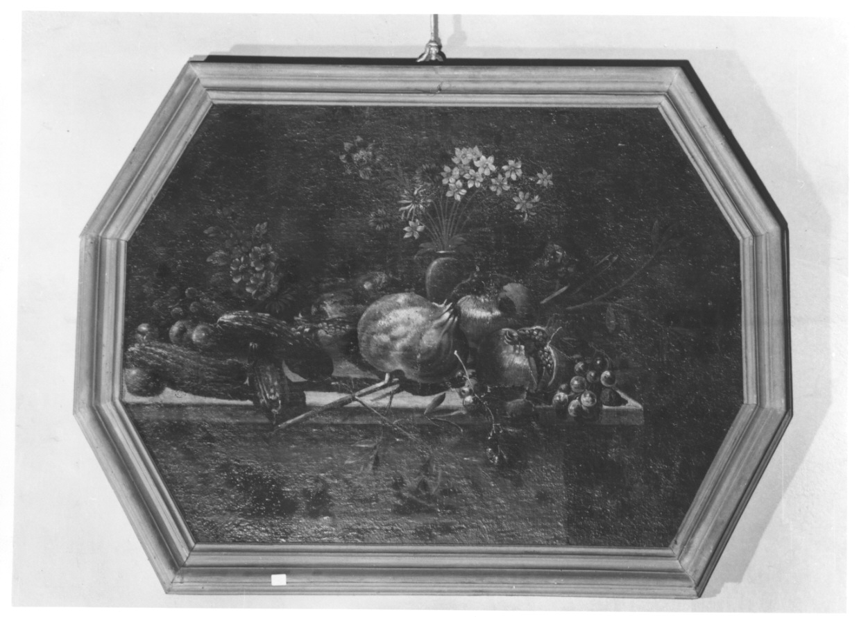 Dipinto a olio su tela, di formato ottagonale, raffigurante una composizione di melagrane, uva, pesche ed altri frutti, con cetrioli, un tralcio fiorito e un vaso di fiori su di un tavolo. Entro cornice in legno verniciato color ocra