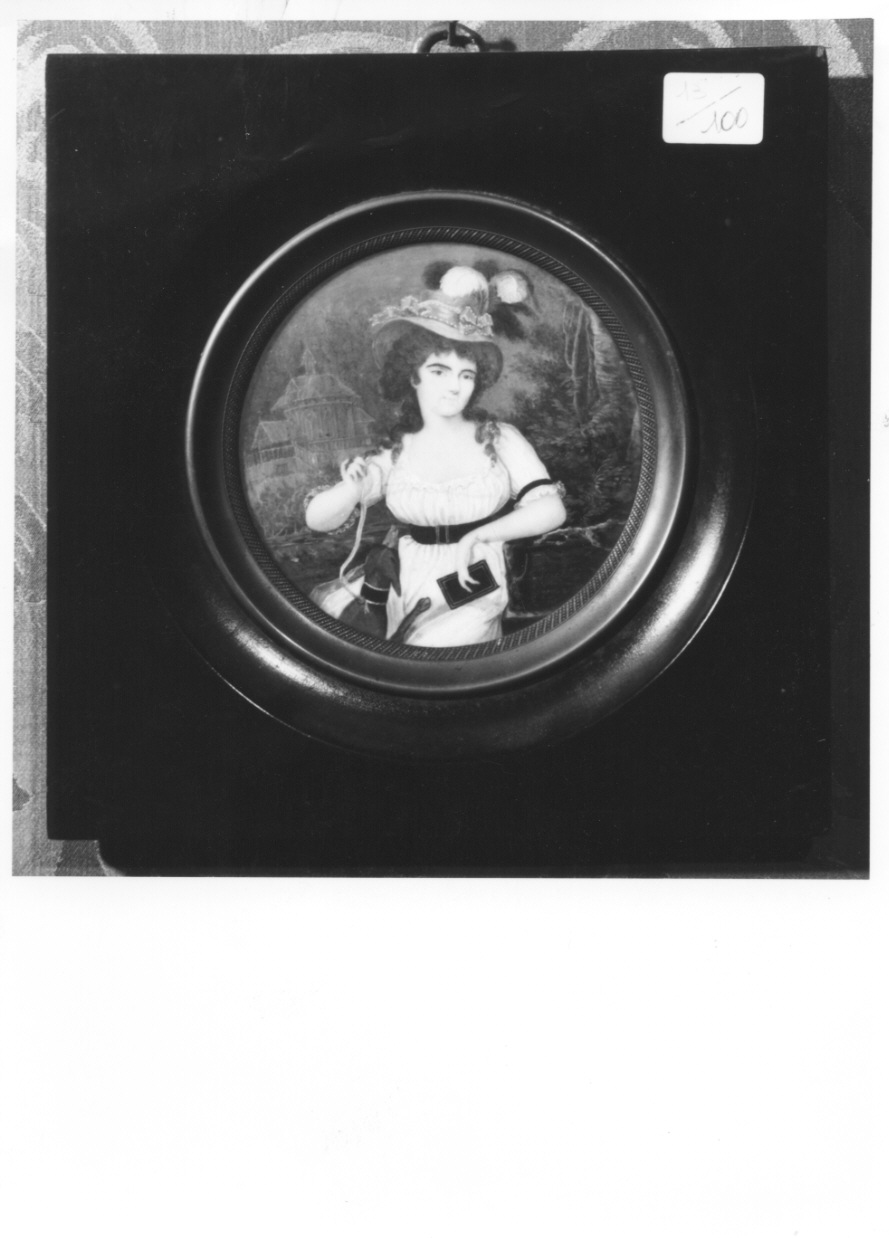 - NOTIZIE STORICO CRITICHE Nata nel 1753, Giuseppina di Lorena morì nel 1797. L'autrice della miniatura è Teresa Pregliasco (notizie tra il 1790 ed il 1820), figlia del noto disegnatore Giacomo Pregliasco. Sulla miniatura in esame si veda L. Levi Momigliano-L. Tos (a cura di), "L'Abate in Biblioteca. I libri di Tommaso Valperga di Caluso", Torino 1999, dove si segnala che Giuseppina di Lorena è rappresentata con il cane Verter sullo sfondo di un grande parco che potrebbe essere quello del castello di Racconigi, dove la principessa amava trascorrere lunghi periodi. La legatura del libro chiuso tra le mani di Giuseppina sembra essere quella dell'Omaggio Poetico che l'abate Tommaso fece stampare a Parma presso Bodoni nel 1792 (cfr. scheda n° 4 dello stesso libro): tra i componimenti poetici, tutti a lei dedicati, 'L'Apoteosi di Verter' evoca il cane amato da Giuseppina e detta in lingue 'esotiche' le epigrafi per il 'Termine' voluto dalla sua padrona nel parco all'inglese di Racconigi. In proposito si veda E. Calderini, "Il giardino all'inglese nel parco di Racconigi, 'isola felice' di Giuseppina di Lorena Carignano", in "Studi Piemontesi", marzo 1993, vol. XXII, fasc. I. Questi elementi indurrebbero a restringere l'arco cronologico d'esecuzione della miniatura tra il 1792, anno della pubblicazione della raccolta poetica di Tommaso, ed il 1797, anno di morte della principessa. Sull'attribuzione dell'opera a Clementina Pregliasco si veda "Notizia delle opere di pittura e scultura esposte nel Palazzo dell'Università", Torino 1820. La miniatura in esame è registrata nel Salotto Rosso nell'inventario del 1929. In proposito si veda E. Ballaira - S. Ghisotti, 'Proposte per il riarredo storico del Castello di Masino', dattiloscritto, 1997, p. 74
