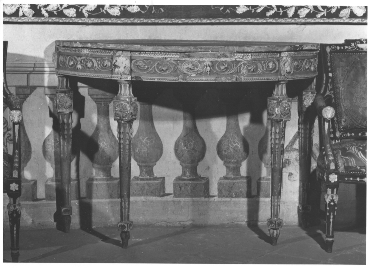 Semicircolare, su quattro gambe tronco-coniche a serti fitomorfi pendenti, con dado sopra al piede a bulbo rovesciato e presso la fascia sottopiano, ove è ornato da margherite. Fascia sottopiano decorata in rilievo da girali fitomorfi, recante protomi leonine in corrispondenza delle gambe. Piano ligneo grezzo di colore verde. Fondo verde veronese, rilievi avorio