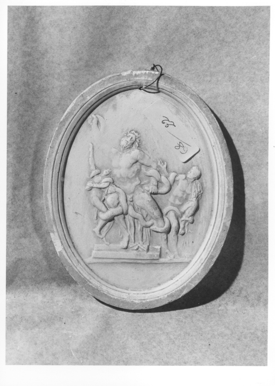 Laocoonte con i due figli cerca di liberarsi dalla morsa dei serpenti. Rilievo di forma ovale