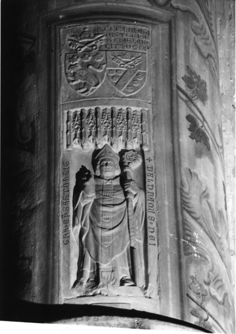 Lapide murata che mostra sul fronte la figura del vescovo, posta sotto due stemmi papali, inclusa in un'edicola e sormontata da un baldacchino di forma convessa con decorazione architettonica gotica. Il prelato viene ritratto con gli emblemi del suo grado e nell'attaggiamento ieratico che gli è proprio. Gli stemmi ripetuti sulla veste ne sottolineano l'appartenenza ad una nobile famiglia cittadina