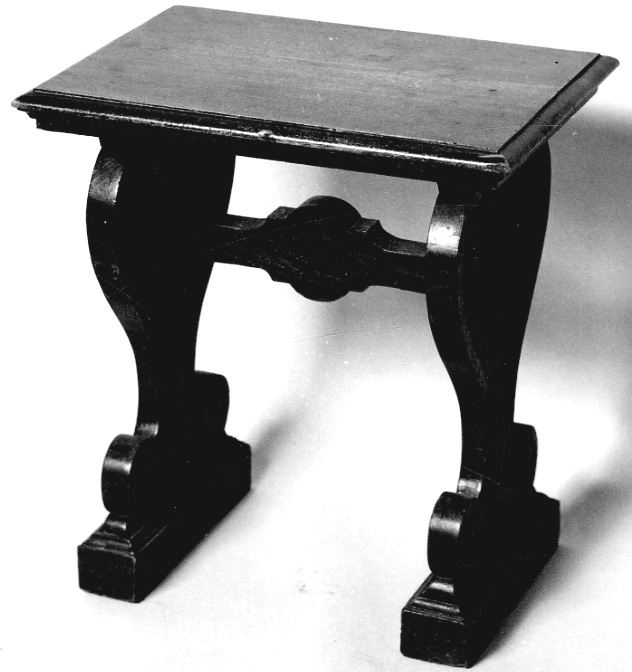Sedile rettangolare con profilo modanato; due assi di sostegno si affrontano sui lati, scolpite a forma di lira ed intagliate (due esemplari sono privi della decorazione ad intaglio), unite da traversa piatta sagomata
