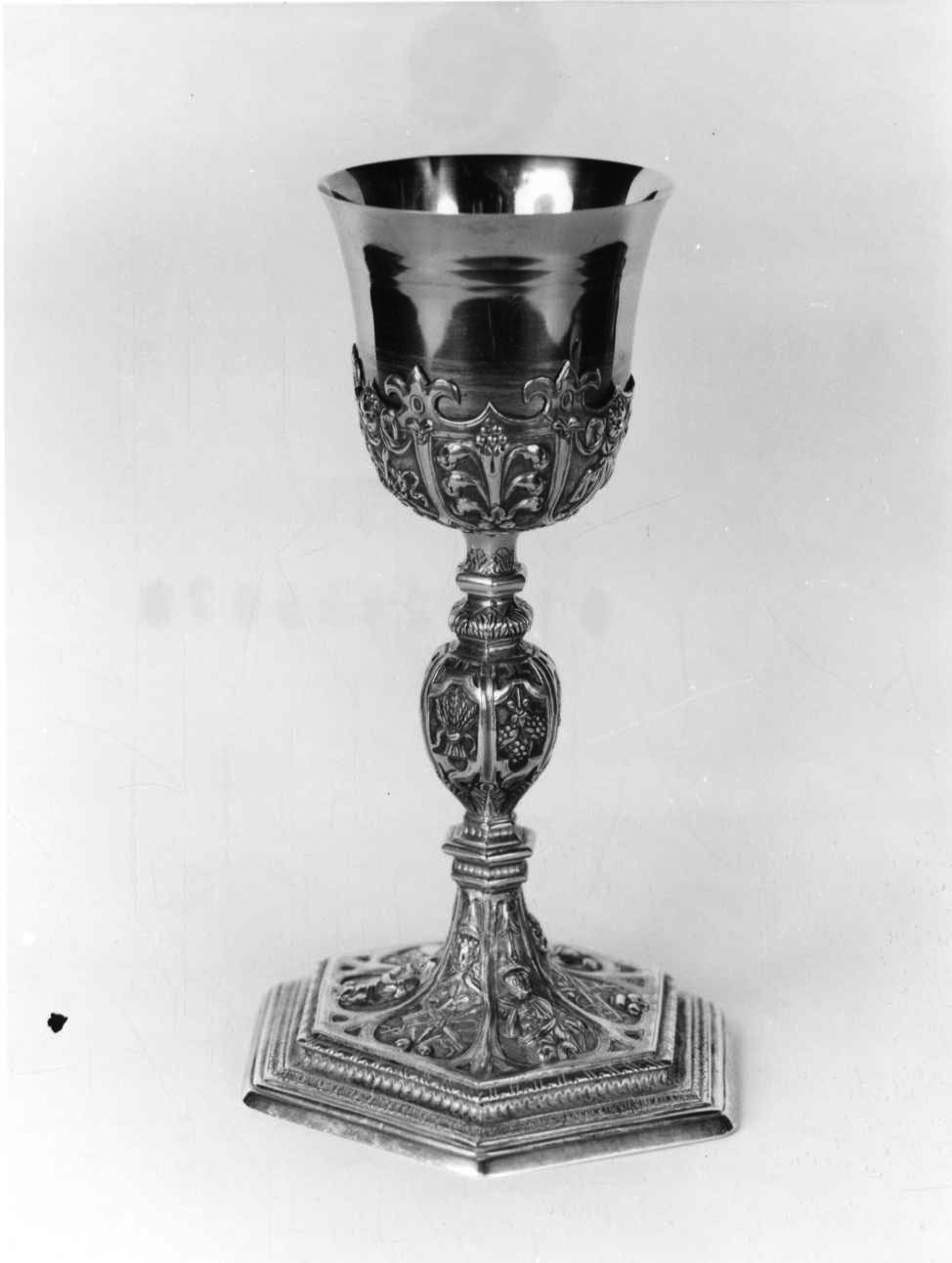 Figura della Vergine e di due santi sul piede esagonale del calice