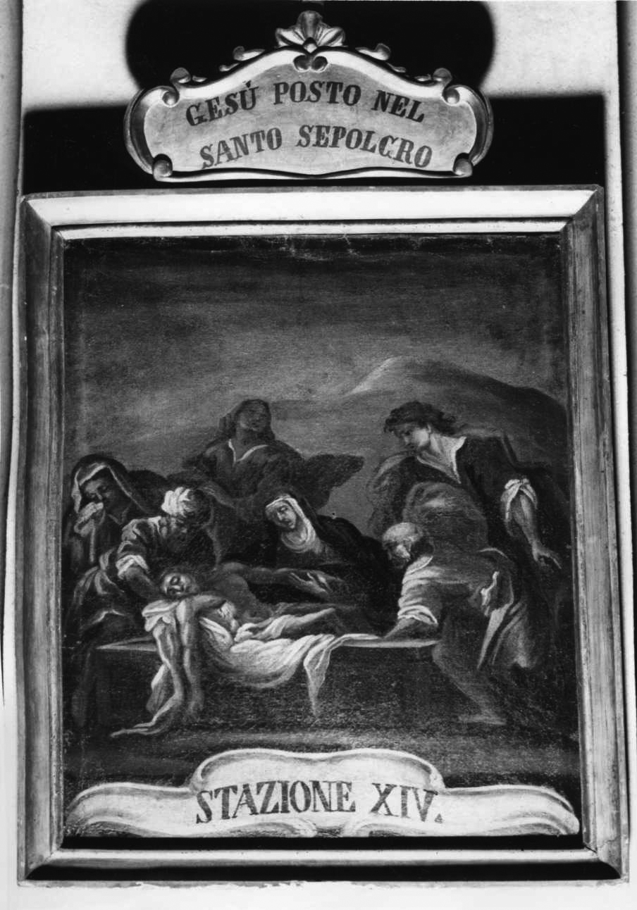 Dipinto raffigurante la quattordicesima Stazione della Via Crucis, con cornice rettangolare in legno dorato e cartella sagomata con iscrizione a ornamento del lato superiore