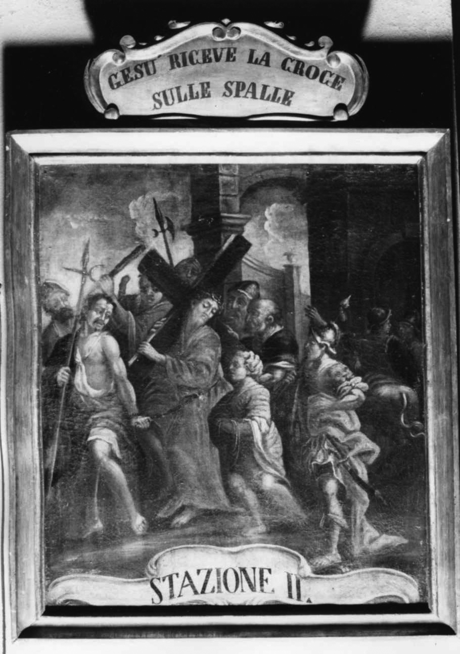 Dipinto raffigurante la seconda Stazione della Via Crucis, con cornice rettangolare in legno dorato e cartella sagomata con iscrizione a ornamento del lato superiore