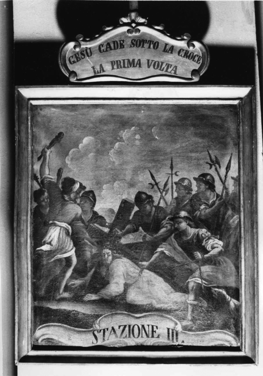 Dipinto raffigurante la terza Stazione della Via Crucis, con cornice rettangolare in legno dorato e cartella sagomata con iscrizione a ornamento del lato superiore