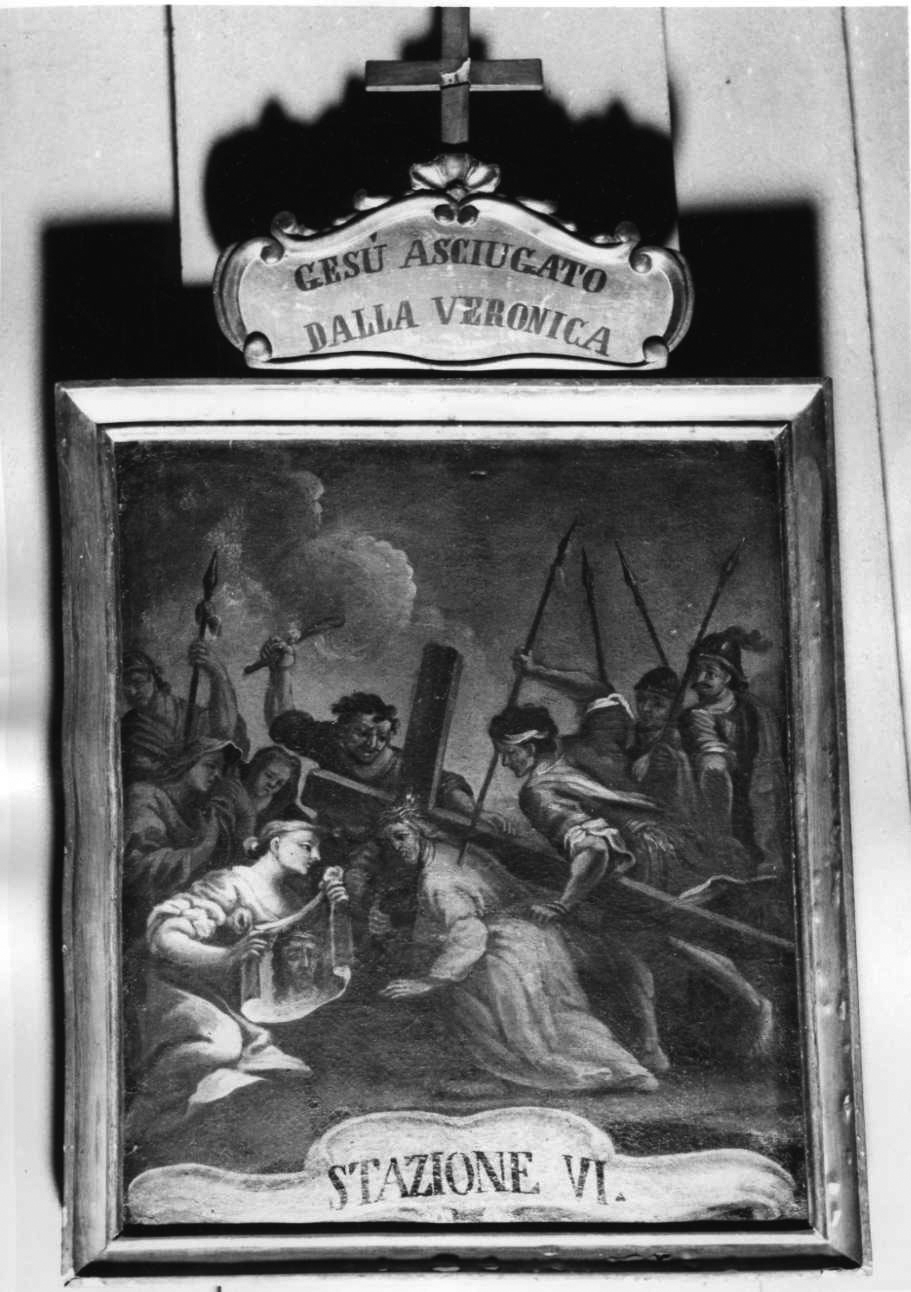Dipinto raffigurante la sesta Stazione della Via Crucis, con cornice rettangolare in legno dorato e cartella sagomata con iscrizione a ornamento del lato superiore