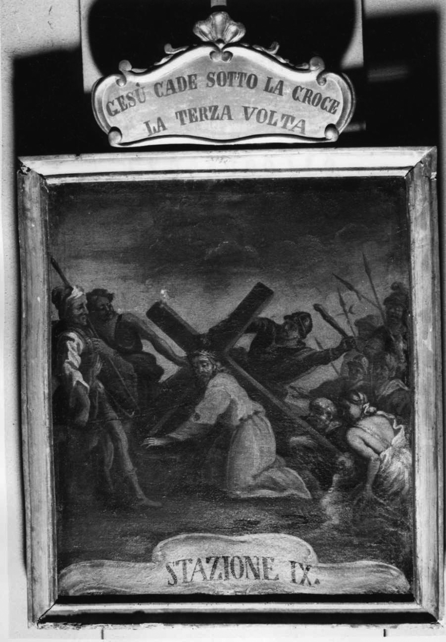 Dipinto raffigurante la nona Stazione della Via Crucis, con cornice rettangolare in legno dorato e cartella sagomata con iscrizione a ornamento del lato superiore