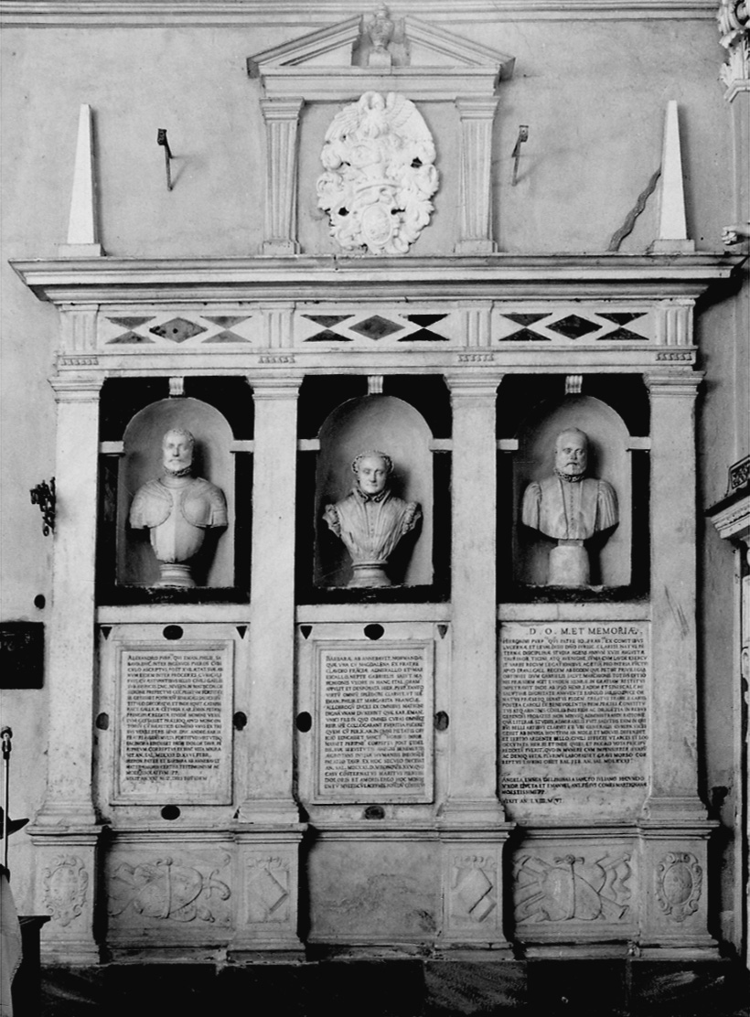 Struttura rettangolare suddivisa da quattro paraste che inquadrano nicchie centinate sovrastanti lapidi incorniciate. Basamento: paraste ornate da stemmi e libri scolpiti a rilievo. Pannelli con armi. Trabeazione decorata da motivi geometrici triangolari e losanghe. Cornice aggettante. Coronamento a struttura architettonica: colonnine sovrastate da un fastigio triangolare, spezzato al centro, contenente un vaso