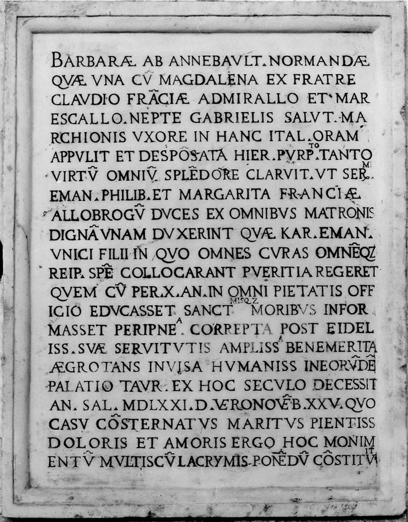 - ISCRIZIONI BARBARAE AB ANNEBAULT. NORMANDAE / QUAE UNA CU MAGDALENA EX FRATRE / CLAUDIO FRACIAE ADMIRALLO ET MAR / ESCALLO NEPTE GABRIELIS SALUT.MA / RCHIONIS UXORE IN HANC ITAL.ORAM / APPULIT ET DESPOSATA HIER. PURP.TO TANTO / VIRTU OMNIU. SPLENDORE CLARUIT. UT SERMI / EMAN. PHILIB. ET MARGARITA FRANCIAE / ALLOBROGU DUCES EX OMNIBUS MATRONIS / DIGNA UNAM DUXERINT QUAE KAR. EMAN. / UNICI FILII IN QUO OMNES CURAS OMNEQZ REIP. SPE COLLOCARANT PUERITIA REGERET QUEM CU PER. X. AN. IN OMNI PIETATIS OFF / ICIO EDUCASSET SANCT. MISQZ MORIBUS INFOR / MASSET PERIPNEA CORREPTA POST EIDEL / ISS. SUAE SERVITUTIS AMPLISS.A BENEMERITA AEGROTANS INVISA HUMANISS INEORUDE / PALATIO TAUR. EX HOC SECULO DECESSIT / AN. SAL. MDLXXI. E. VERONOUEB. XXV. QUO / CASU COSTERNATUS MARITUS PIENTISS / DOLORIS ET AMORIS ERGO HOC MONIMENTU MULTISCU LACRYMIS PONEDU COSTITUIT - lettere capitali - a incisione - latino
