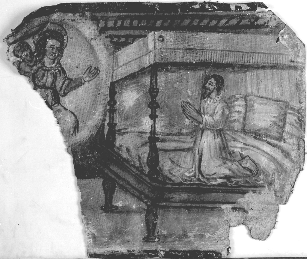 In alto a sinistra compare la Vergine col Bambino. In un grande letto a baldacchino che occupa quasi tutta la superficie del dipinto è genuflesso un uomo con una veste bianca in preghiera