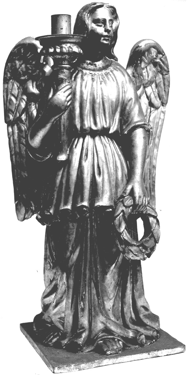 L'angelo regge una torcia con la mano destra e con la sinistra una corona di alloro