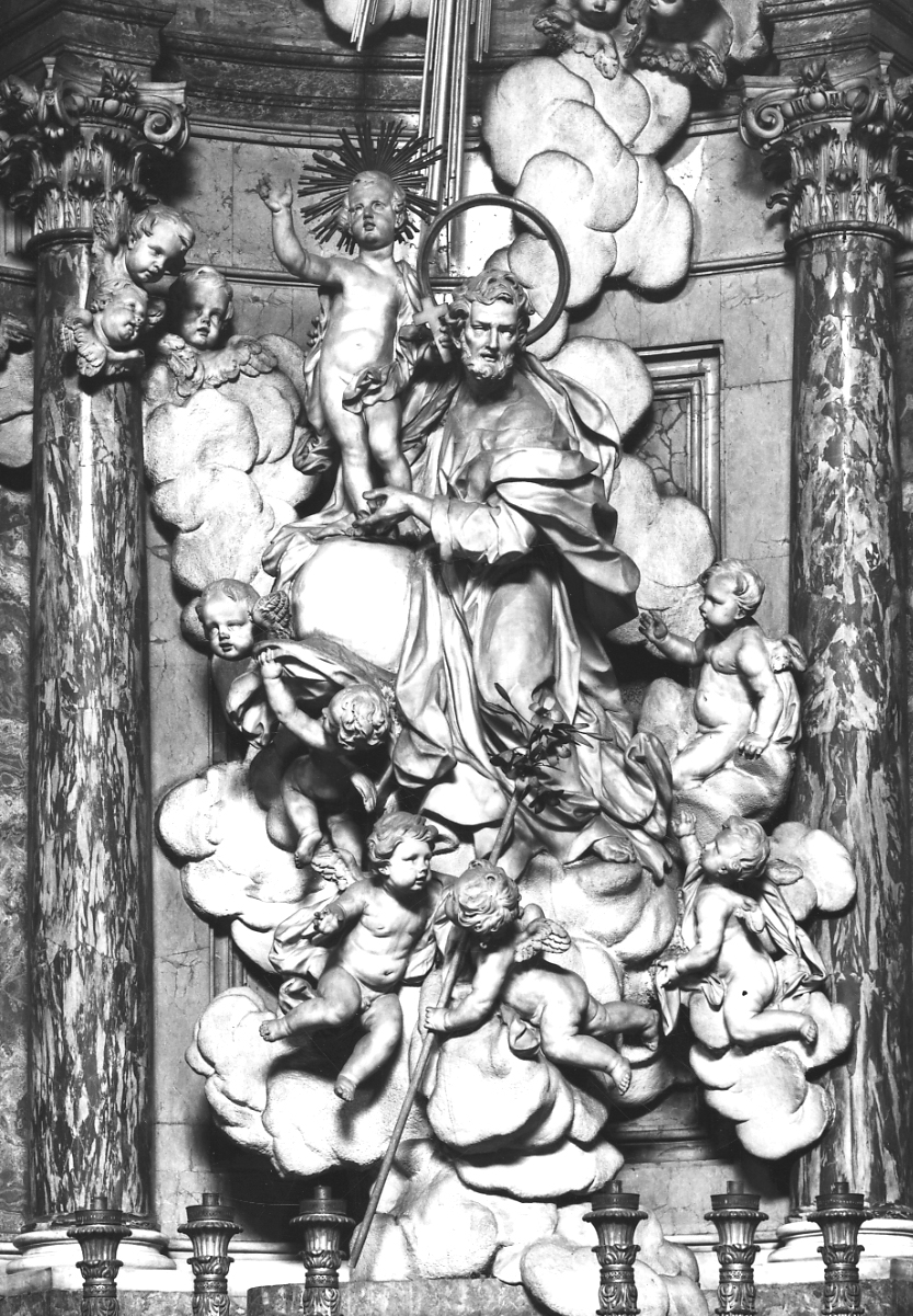 - NOTIZIE STORICO CRITICHE Il gruppo scultoreo, raffigurante San Giuseppe in gloria con Gesù Bambino, fu eseguito nel 1733 dallo scultore Simone Martinez, nipote di Filippo Juvarra, secondo il progetto di quest'ultimo. All'epoca della committenza, il Martinez si trovava a Roma, città nella quale risiedeva da alcuni anni. La scultura giunse nella capitale sabauda al seguito del suo autore e venne collocata sull'altare di S. Giuseppe nel 1736. Due anni più tardi, nel 1638, Simone Martinez fu insignito della nomina di direttore dell' Accademia di scultura torinese
