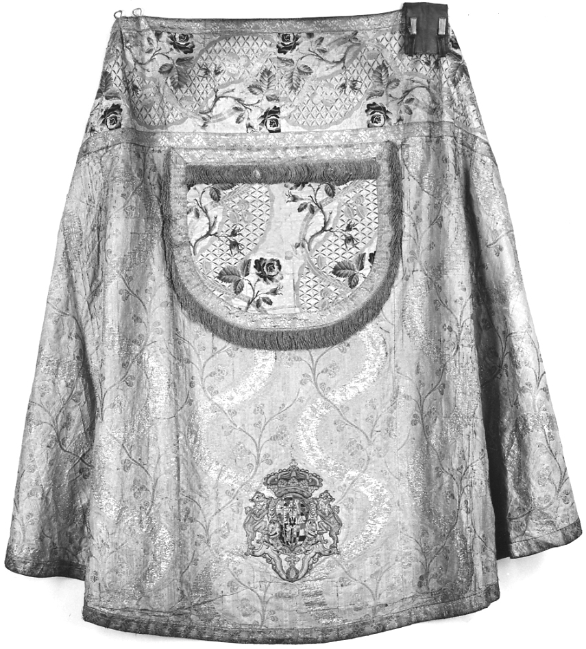 Il paramento liturgico è in seta broccata color perla e si compone di piviale, Tunicella, manipolo, pianeta, stola, borsa