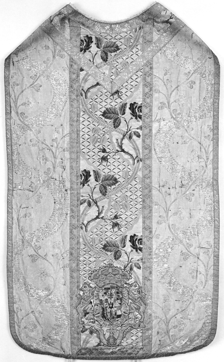 Armatura in seta color perla e broccature che disegnano motivi vegetali; ricami di rose, disposte su grata a losanghe, gallone applicato. Decorazione a ricamo con stemma sabaudo applicata