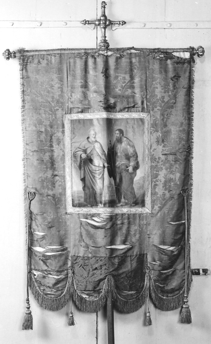 Soggetti sacri. Personaggi: San Pietro; San Paolo. Attributi: (San Pietro) chiavi; (San Paolo) spada. Abbigliamento religioso. Paesaggi