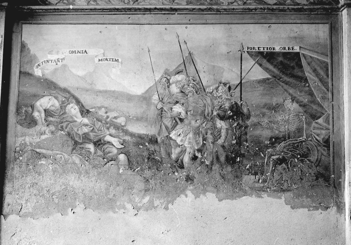 Soggetti profani. Figure: figure maschili; figure femminili; guerrieri. Abbigliamento. Allegorie-simboli: (Morte) scheletro. Oggetti: elmi; corazze; tenda; trono. Armi: lance. Paesaggi: monti; rocce