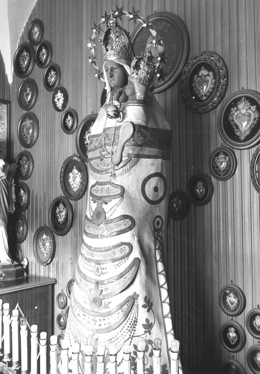 Soggetti sacri. Personaggi: Madonna; Gesù Bambino. Attributi: (Madonna) corona; (Gesù Bambino) corona. Simboli mariani: corona di dodici stelle. Oggetti: globo; rosario. Abbigliamento
