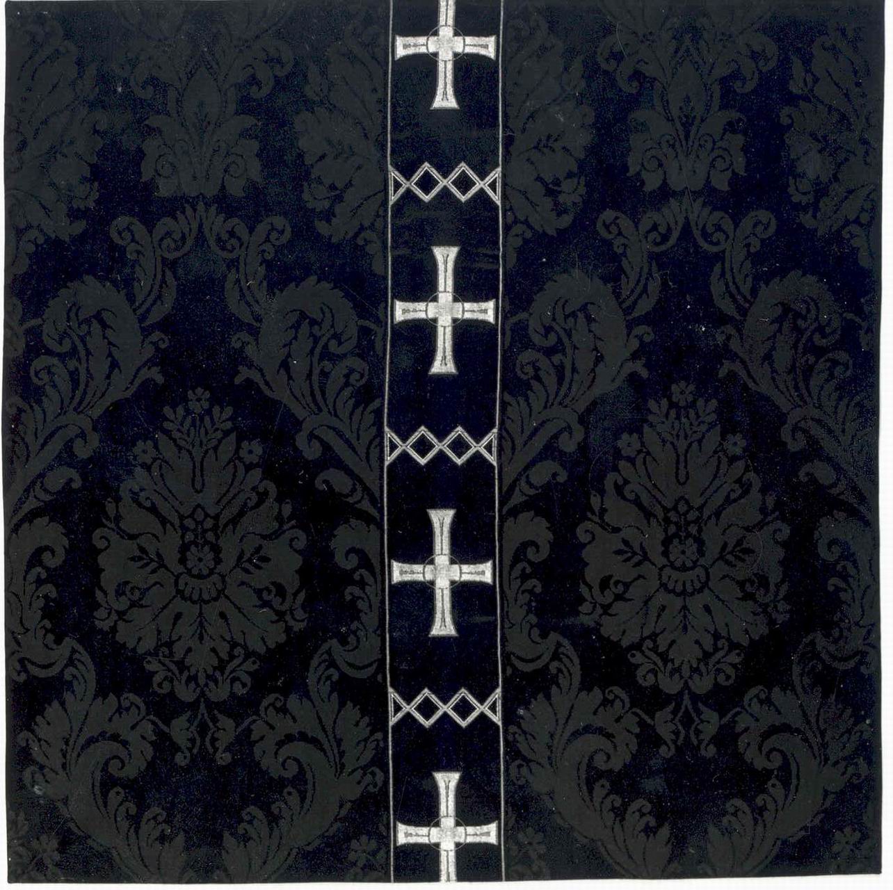 Ogniuno dei due veli è confezionato con un pannello di damasco ed è foderato con un telo di diagonale di cotone nero. Al centro, per tutta la lunghezza del manufatto, è posto il nastro in raso nero, decorato con croci intervallate da una cornice a rombi