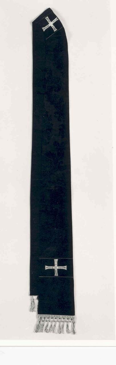 Ognuna delle due stole, dall'andamento rettangolare, è confezionata con divrsipannelli di damasco ed è foderata con diagonale di cotone nero. Le tre croci, poste al centro del troncone e poco sopra la fine dell'insegna, è realizzata impiegando il nastro in raso nero, decorato con una croce in oro filato. Gli orli sono rifiniti con frange in oro filato, con la gonna con una legatura cousue droit su due ranghi