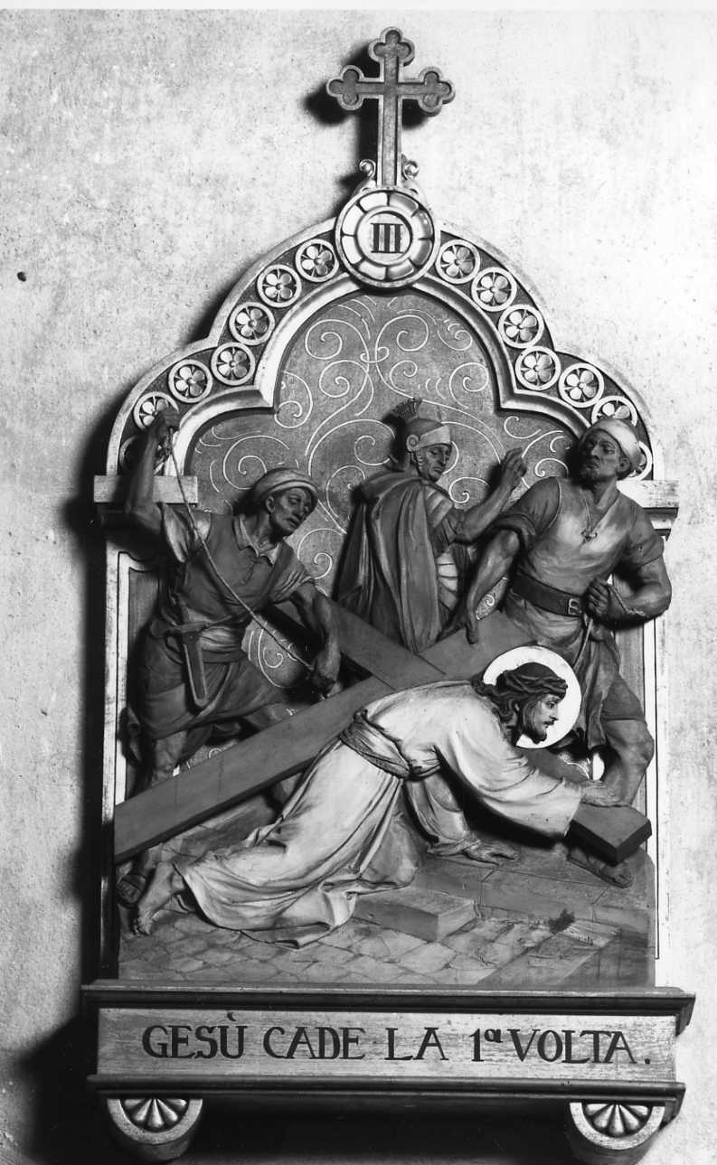 Raffigura Gesù Cristo incoronato di spine che si accascia sotto il peso della croce; accanto a lui, alcuni soldati lo percuotono e lo tirano tramite corde per farlo rialzare