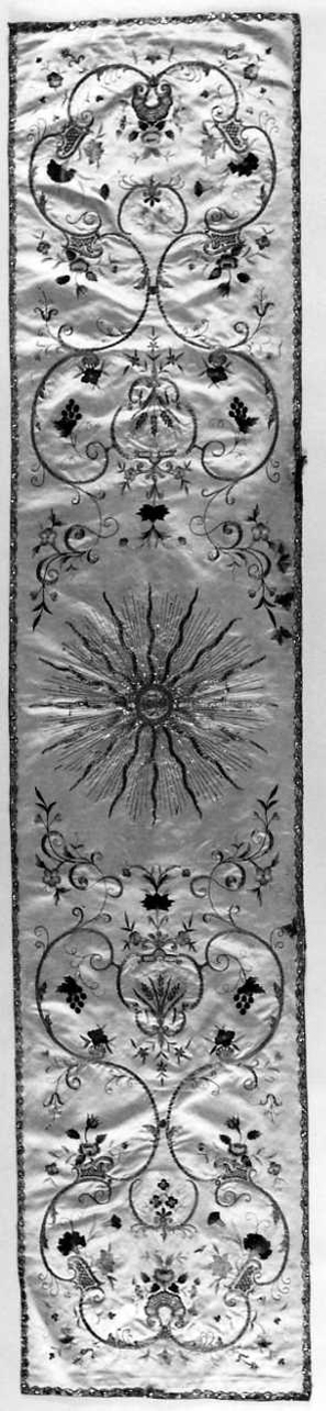 Il velo è confezionato in raso di seta chiaro ricamato in seta policroma con motivi di volute, festoni, baldacchini con nappe e tralci fitomorfi. Al centro, monogramma cristologico circondato da raggi a fasci e raggi fiammeggianti. Rifinito da un gallone in filo dorato (?)