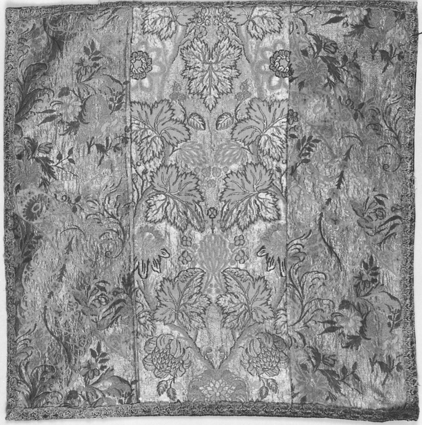 Fondo avorio laminato con filo d'argento; disegno broccato in seta verde, rosa, azzurra e filo d'argento. Gallone in filo d'argento