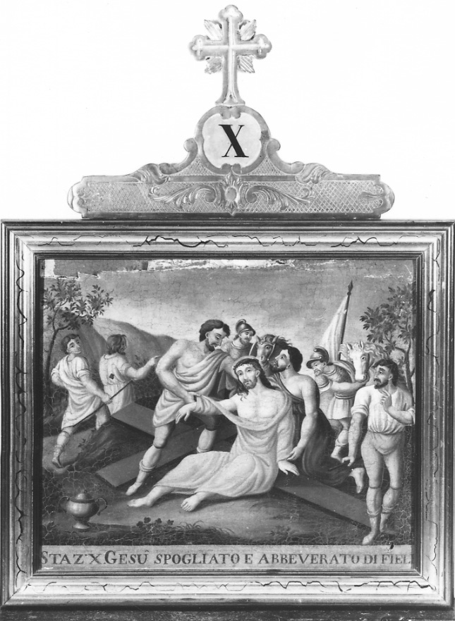 - ISCRIZIONI in basso - STAZ. X GESU SPOGLIATO E ABBEVERATO DI FIELE - lettere capitali - a pennello - latino