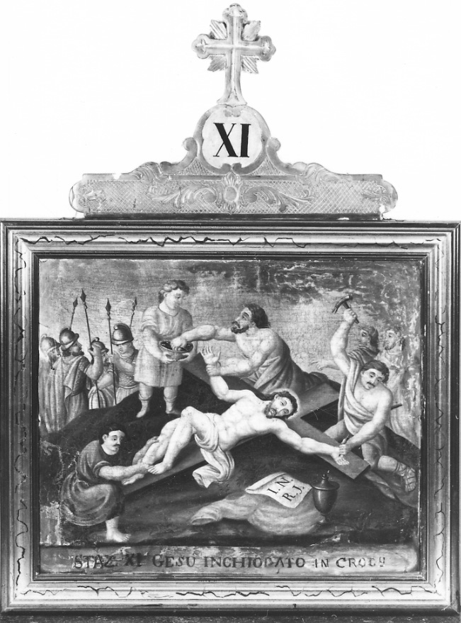 - ISCRIZIONI in basso - STAZ. XI GESU INCHIODATO ALLA CROCE - lettere capitali - a pennello - latino