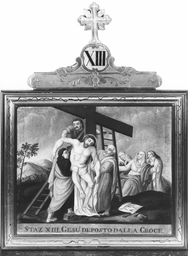 - ISCRIZIONI in basso - STAZ. XIII GESU DEPOSTO DALLA CROCE - lettere capitali - a pennello - latino