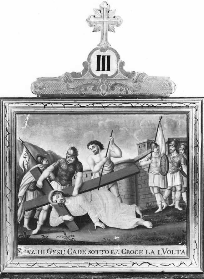 - ISCRIZIONI in basso - STAZ. III GESU CADE SOTTO LA CROCE LA I VOLTA - lettere capitali - a pennello - latino
