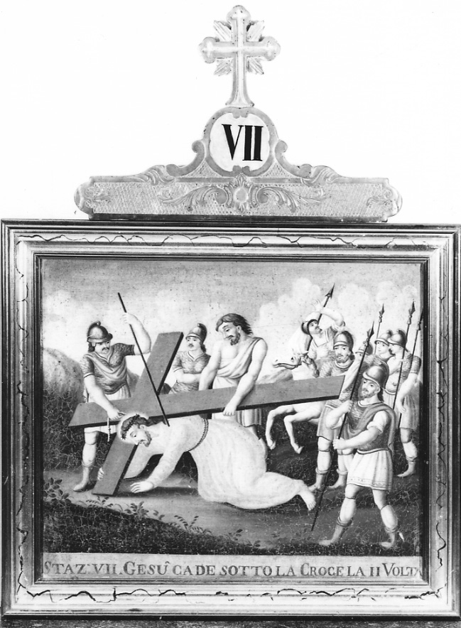 - ISCRIZIONI in basso - STAZ. VII GESU CADE SOTTO LA CROCE LA II VOLTA - lettere capitali - a pennello - latino