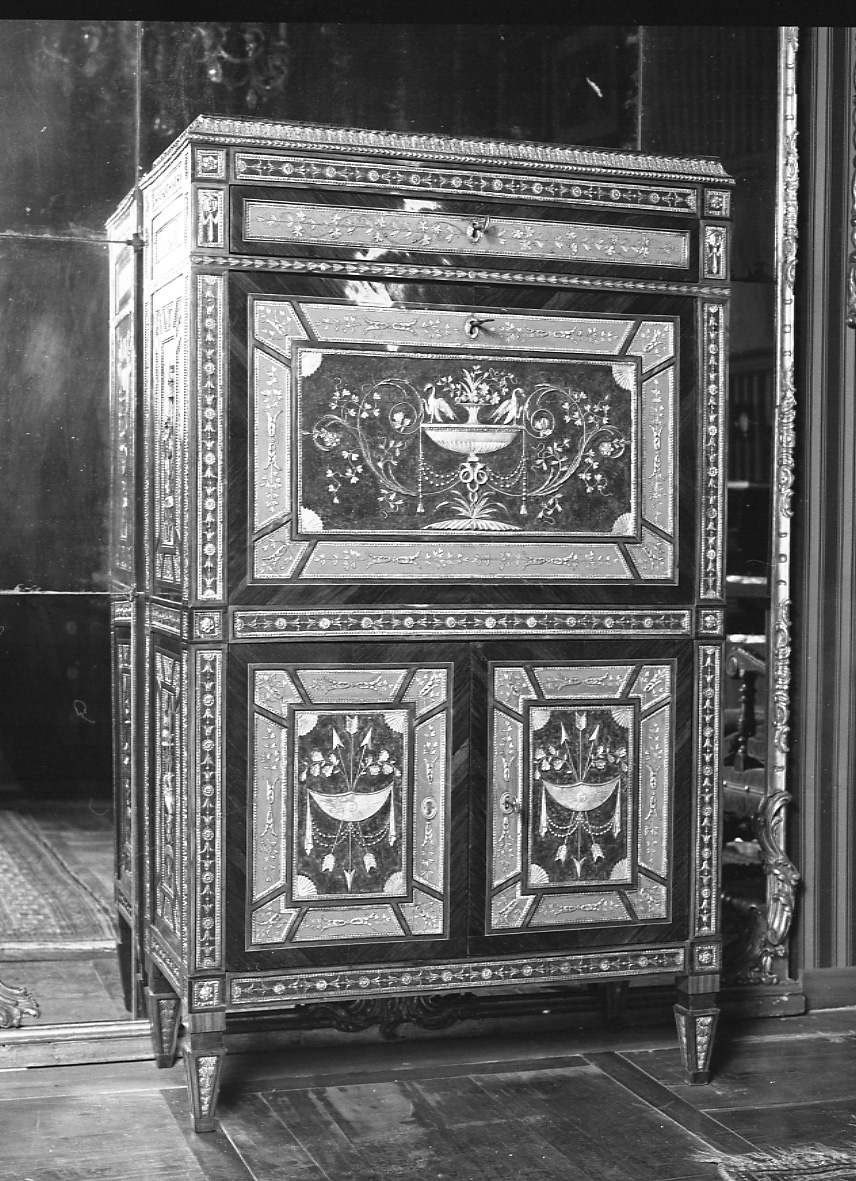 Suddiviso in pannelli, raffigura nella calatoia una fontana con cinque girali fogliati e negli sportelli tre freccie con festone. Sui fianchi, i pannelli sono ornati da draghi con fiaccole. All'interno, sei cassetti riparati dai due sportelli della parte inferiore; una serie di scansie dietro la ribalta