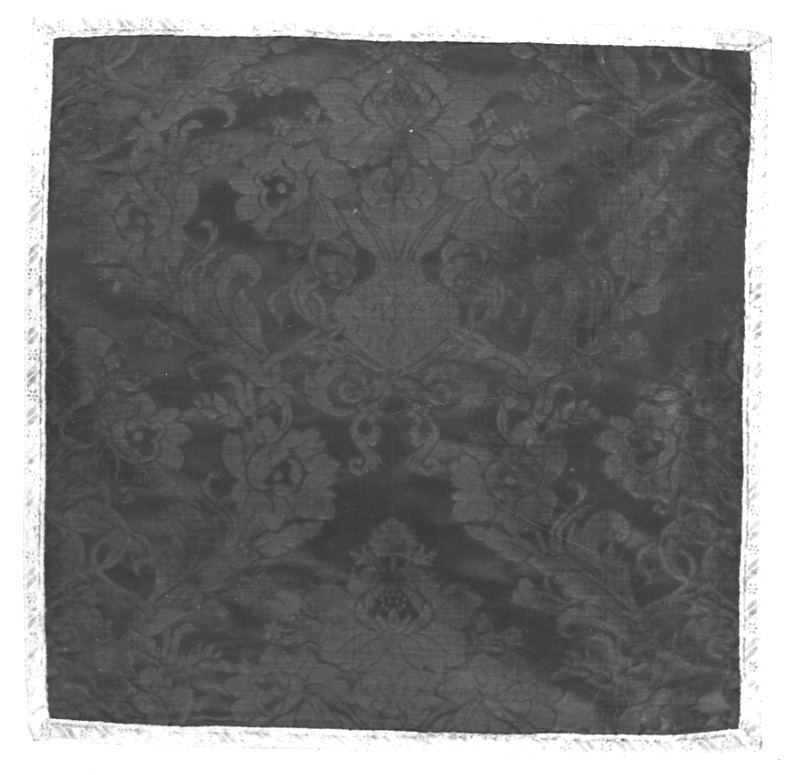 Fondo e decoro color verde. fodera in cotone giallo, sostituita. Gallone in filo d'argento e seta