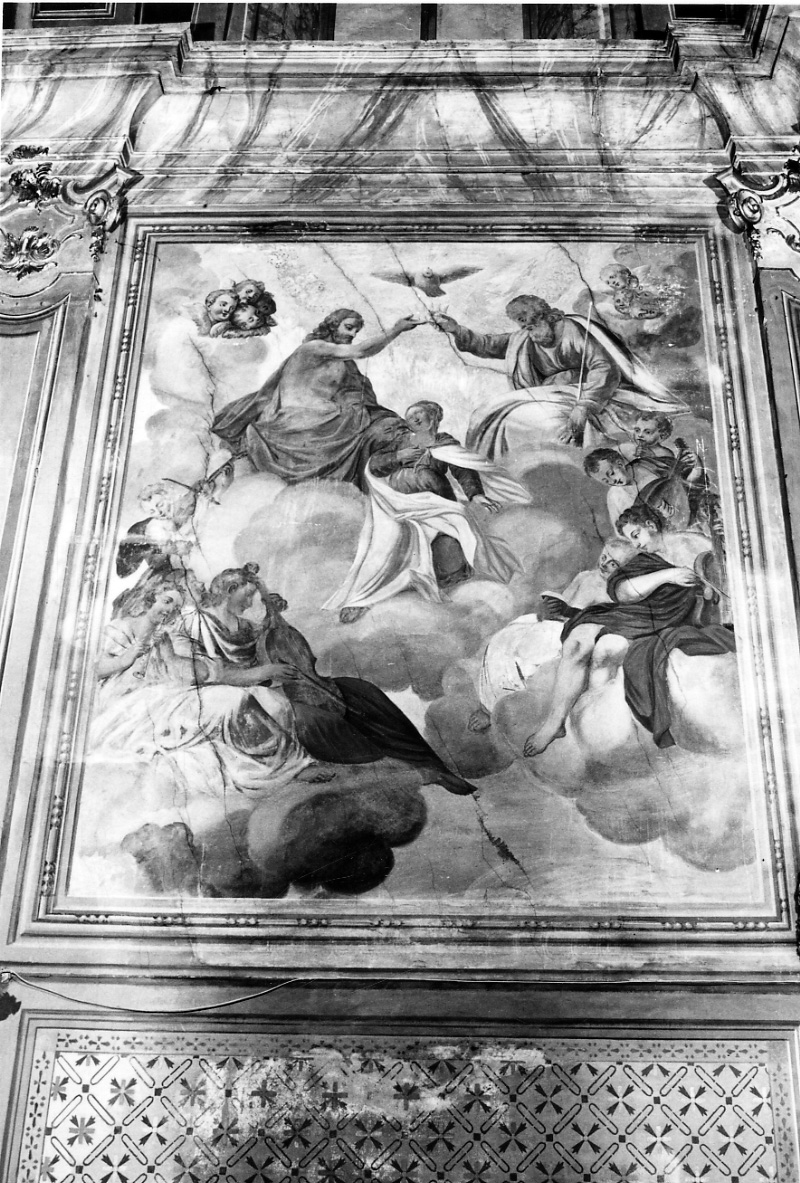 Soggetti sacri. Personaggi: Maria Vergine; Dio Padre; Cristo; Spirito Santo come colomba. Figure: angeli; angeli musicanti; cherubini. Strumenti musicali: viola; violino; liuto. Paesaggi: cielo; nubi. Abbigliamento