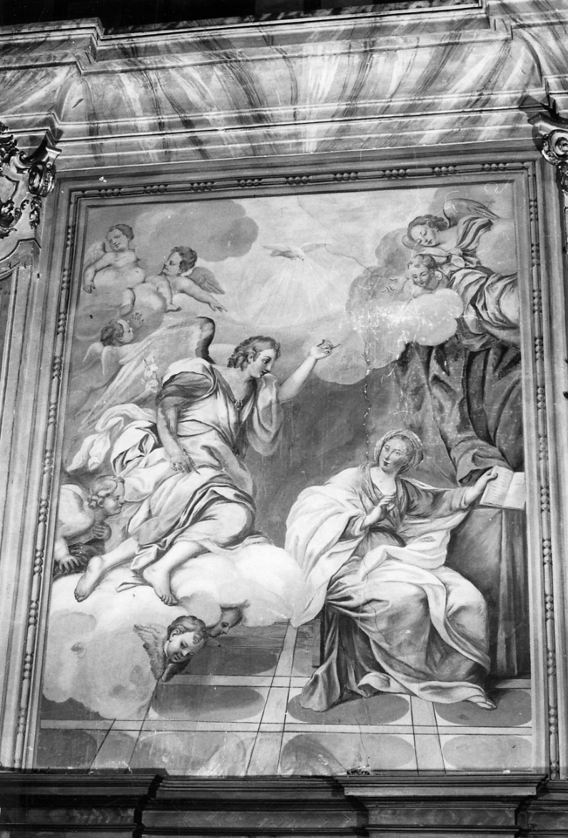 Soggetti sacri. Personaggi: Maria Vergine; arcangelo Gabriele; Spirito Santo come colomba. Attributi: (Maria Vergine) libro; (arcangelo Gabriele) giglio. Abbigliamento. Figure: angeli; cherubini. Interno: casa. Costruzioni: pavimento. Oggetti: drappo; leggio