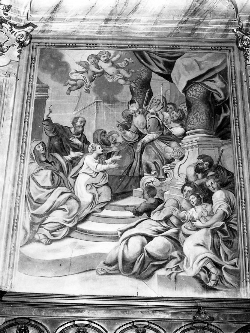 Soggetti sacri. Personaggi: Maria Vergine; Sant' Anna; San Gioacchino; sommo sacerdote. Figure: figure maschili; figure femminili; angeli. Interno: tempio. Elementi architettonici: colonne tortili; gradini; trono. Oggetti: drappo; candele; bastone